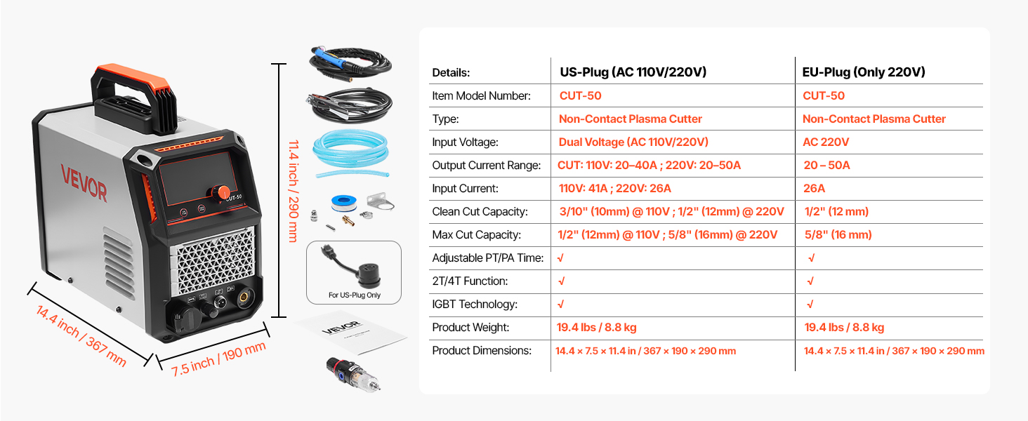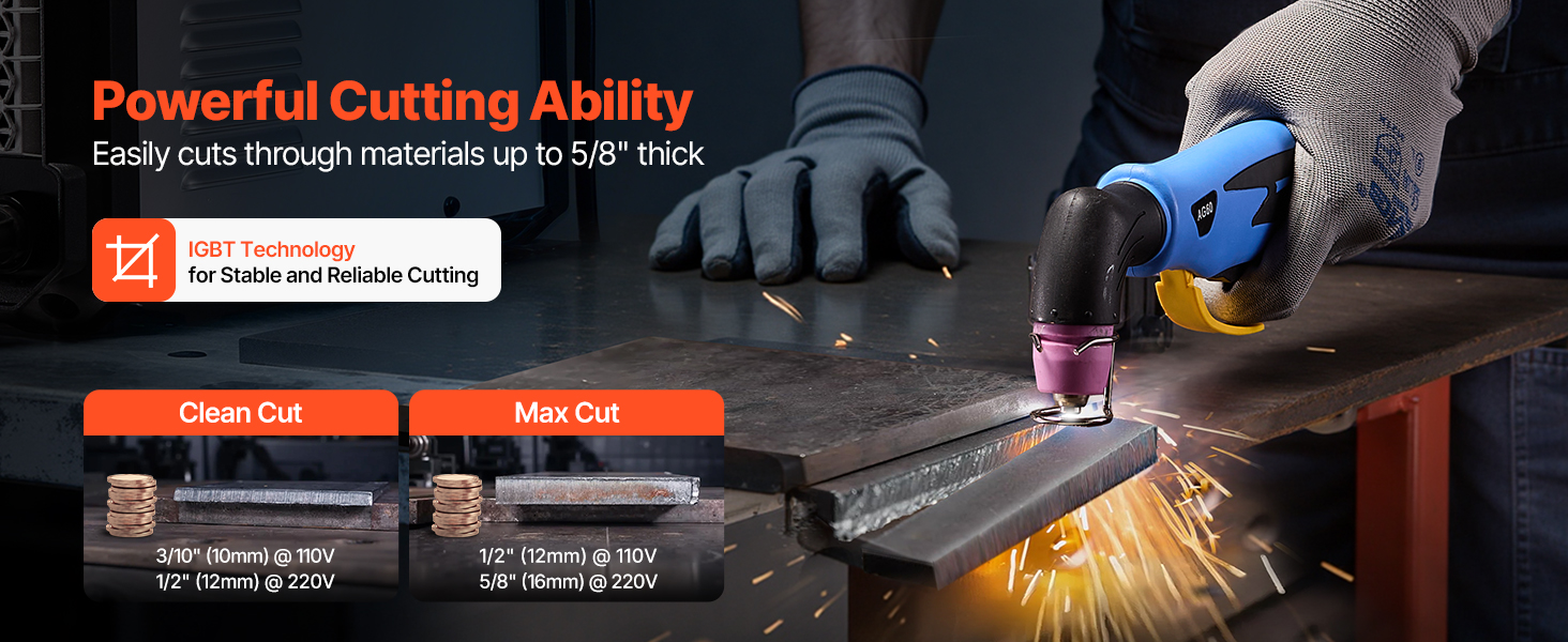 - Powerful Cutting: This VEVOR plasma cutter delivers a maximum output current of 50A for powerful cutting. It supports clean cuts up to 3/10" (10mm) at 110V and 1/2" (12mm) at 220V, with a maximum cutting thickness of 1/2" (12mm) at 110V and 5/8" (16mm) at 220V