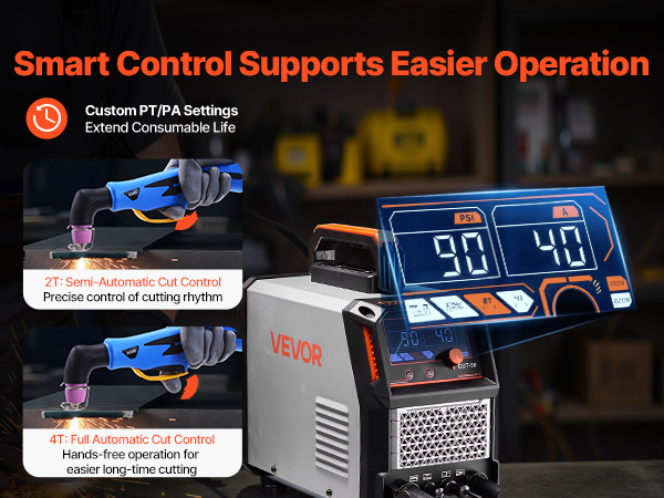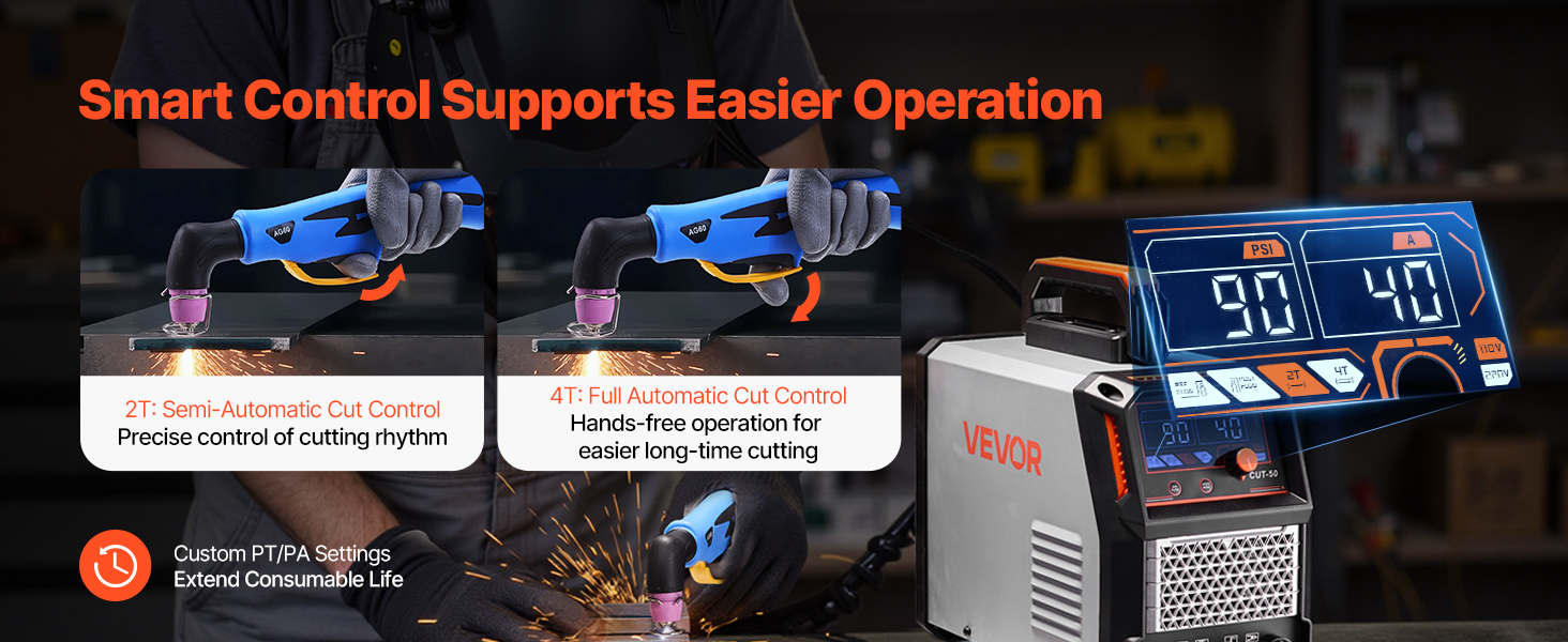 - Intelligent Control: Featuring adjustable PT time (1-6s) and PA time (0.1-3s) to extend the life of consumables. Also comes with 2T/4T functions: 2T provides semi-automatic cutting for short, precise tasks, 4T allows automatic cutting for long-term continuous operation