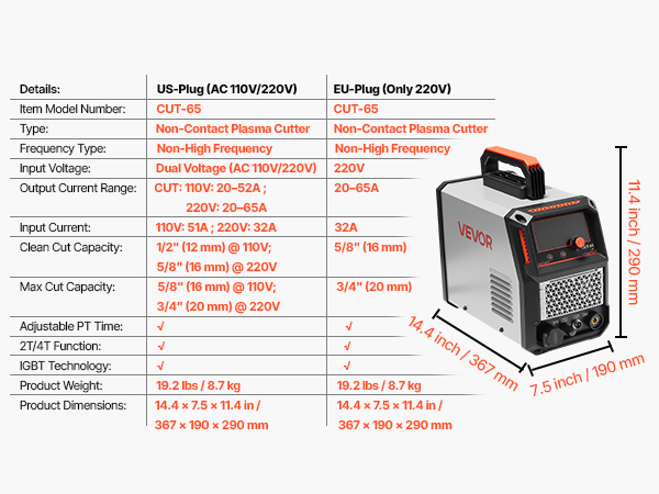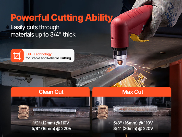 - Powerful Cutting: This VEVOR plasma cutter delivers a maximum output current of 65A with powerful cutting ability. It supports clean cuts up to 1/2" (12mm) at 110V and 5/8" (16mm) at 220V, with a maximum cutting thickness of 5/8" (16mm) at 110V and 3/4" (20mm) at 220V