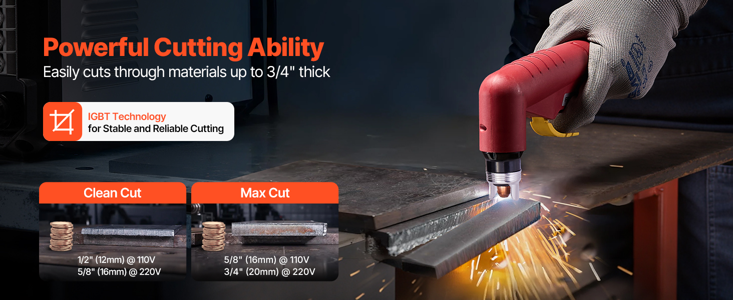 65A maximum output current supports clean cuts up to 1/2″ (12mm) at 110V and 5/8″ (16mm) at 220V, with a maximum cutting thickness of 5/8″ (16mm) at 110V and 3/4″ (20mm) at 220V.