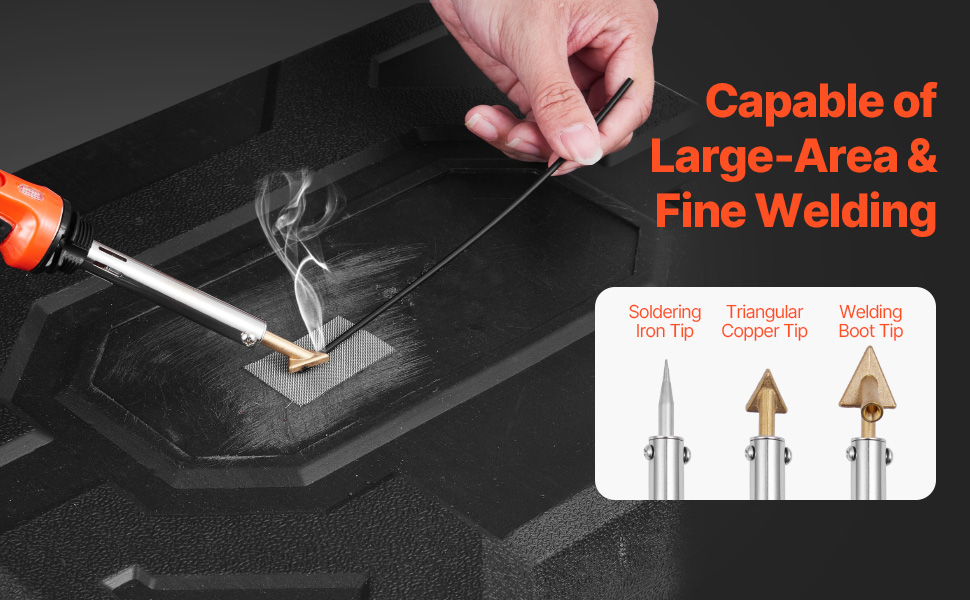 Our plastic repair welder kit comes with 3 welding tips, with large contact areas and fast heat conduction. The boot welding tip is for large welding areas, the triangular copper tip is for fine welding, and the soldering iron tip is ideal for electronics repairs.