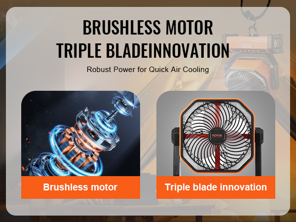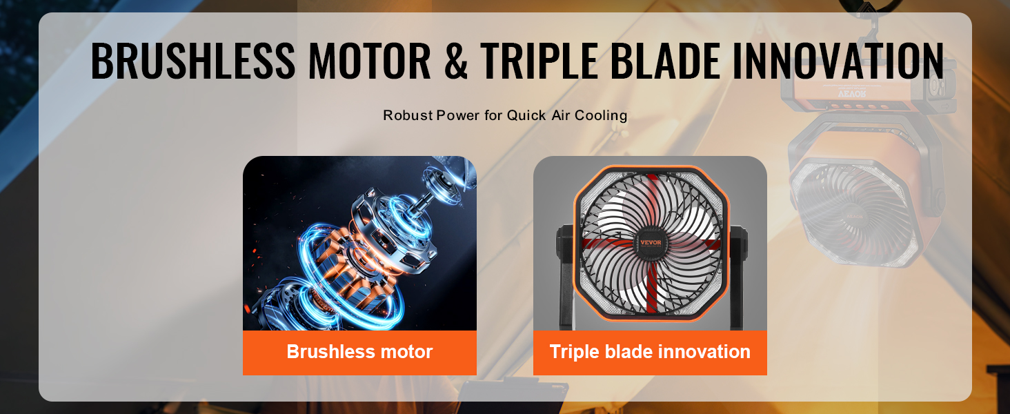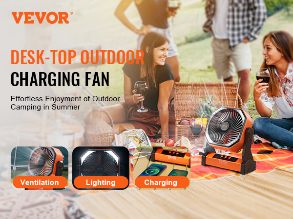 The VEVOR desktop charging fan features a brushless motor and dual fan blade design, increasing airflow and offering 4 adjustable fan speeds for various wind modes to meet different needs. It is compact, lightweight, and easy to carry, making it ideal for picnics, barbecues, car trips, and more.