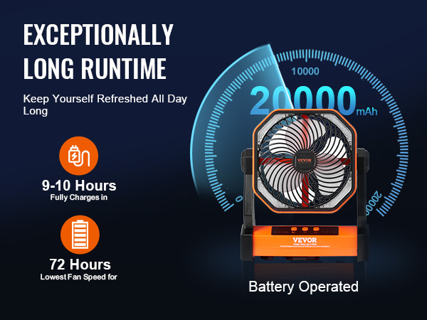 - High-Quality Battery: This desktop charging fan is powered by a 20,000mAh rechargeable battery, providing a long working time of up to 72 hours at the lowest fan speed. This ensures prolonged cooling, and it can be fully charged in 9-10 hours.