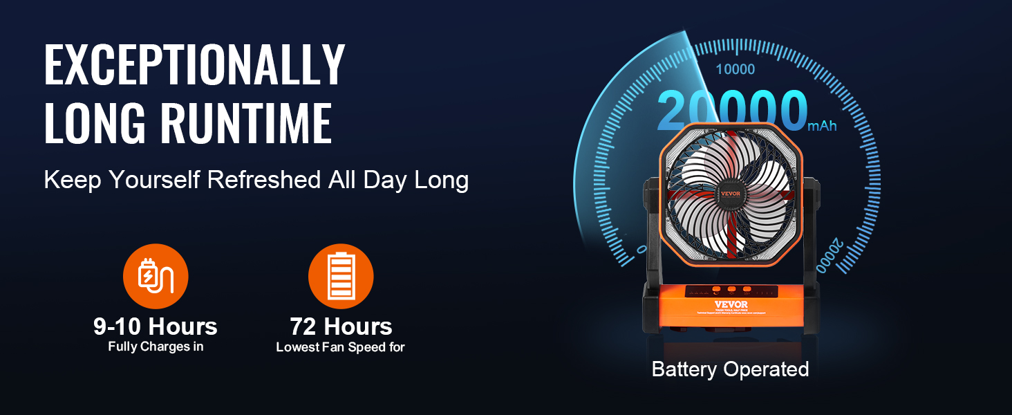 The fan has a built-in high-capacity battery and uses the latest fast charging technology, requiring just 9-10 hours for a full charge. With a single charge, it can run continuously for 72 hours at the lowest fan speed setting, keeping you cool and comfortable throughout the day.