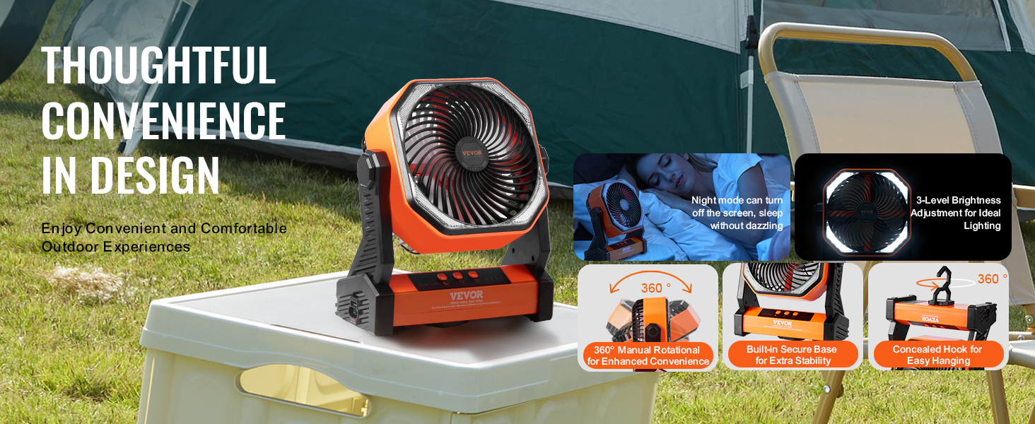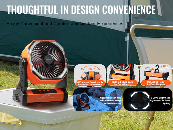 Come with 16 surrounding LED lights with 3 levels of adjustable brightness, providing an ideal light source for nighttime outdoor activities. The fan has a stable base that securely holds the fan even during high-speed operation.