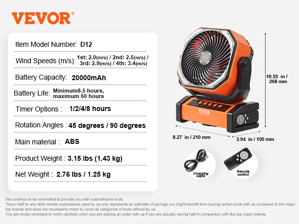 Very good fan. It’s small and compact, not as big and bulky as I expected. Battery lasts a very long time. You can leave it running for several nights off one charge. The lights are extremely bright and really do light up the space, all the functions work properly. I sleep inside of a vehicle where I do not have air conditioning or electricity, so a high quality battery powered USB-C portable fan is extremely important for me and this fan works great. So far, it seems to be well built and something that should last quite awhile. I definitely would recommend this particular fan. With all of the no name Chinese products on Vevor, you never really know what you’re going to get when you make a purchase, or if you’re getting something that is junk, but this product is awesome. Love it. It also has dual blades. I’m very impressed with the battery life. It would be nice if it charged faster, but it’s still incredible easy for me to keep charged even when not living in a home, using a power Bank. I can leave it running over night and still have nearly full or above 75% charge when I wake up, or charge it off the power Bank at night and wake up with it at 100%. I would like to add that I absolutely love the night mode, which turns off the power level and fan mode lights. Those little lights are pretty bright, so you want to turn them off when you sleep, especially if you sleep in a vehicle and want to be unnoticed. Not all fans have the sleep mode. I have been using this fan for at least a month and it’s still great, no complaints. I love it.