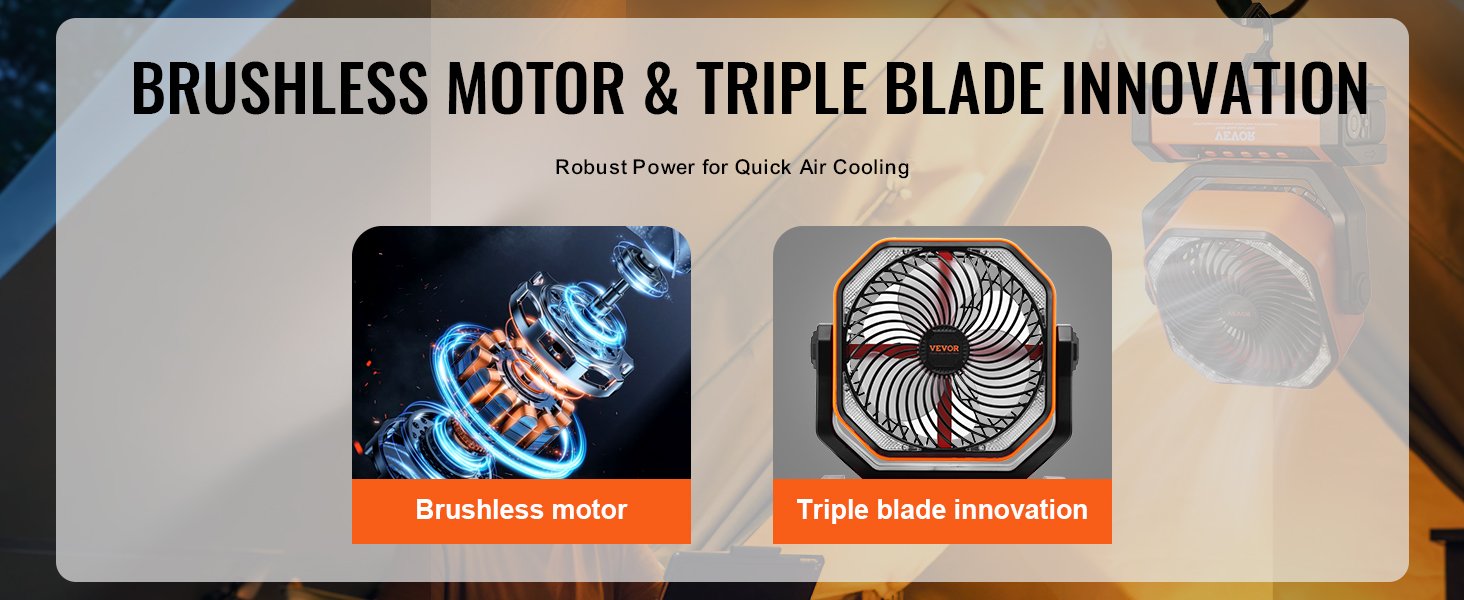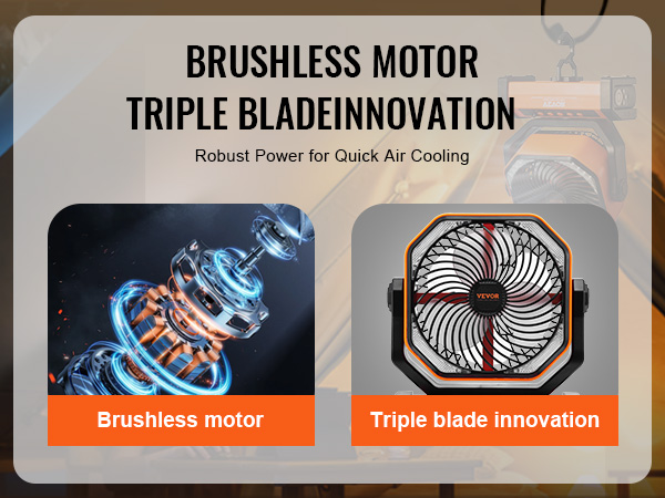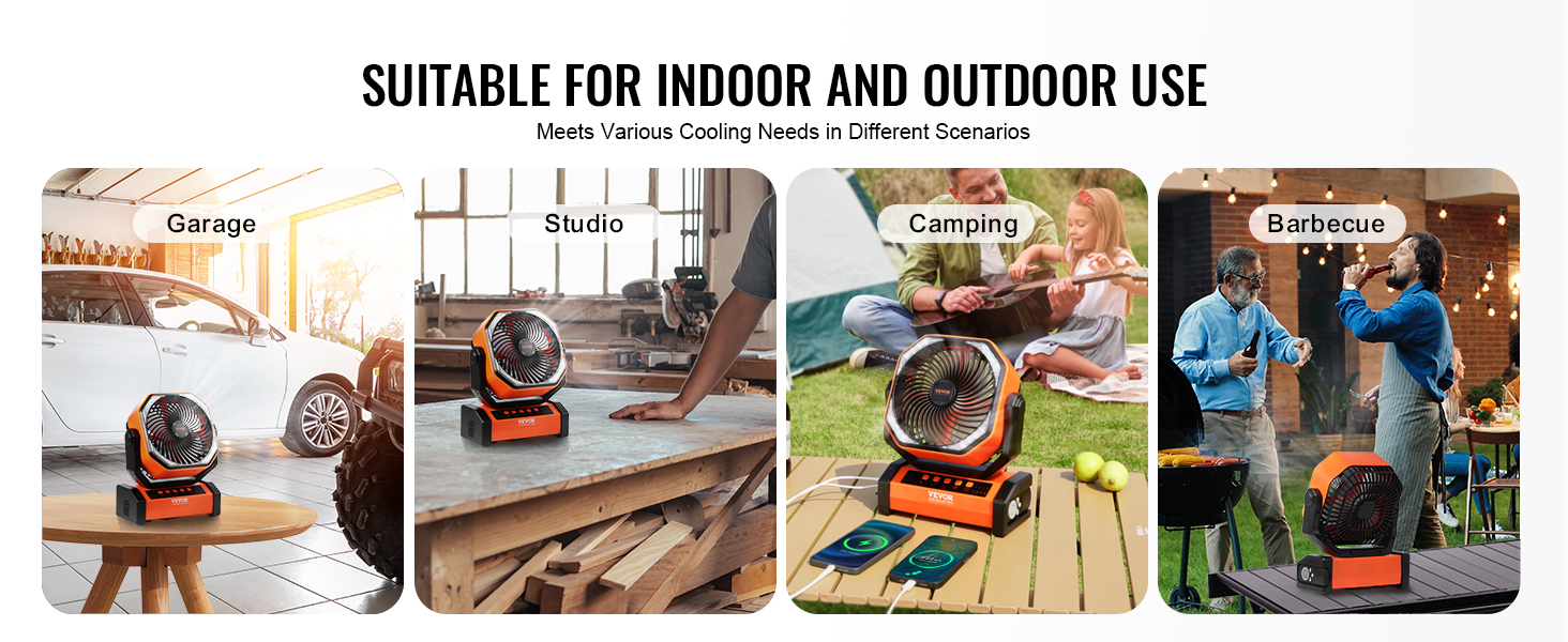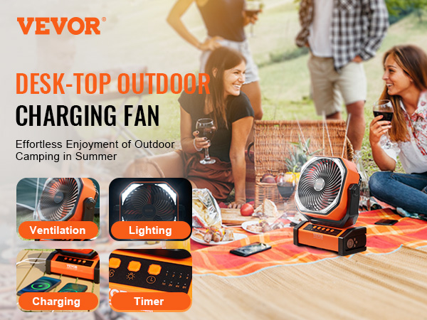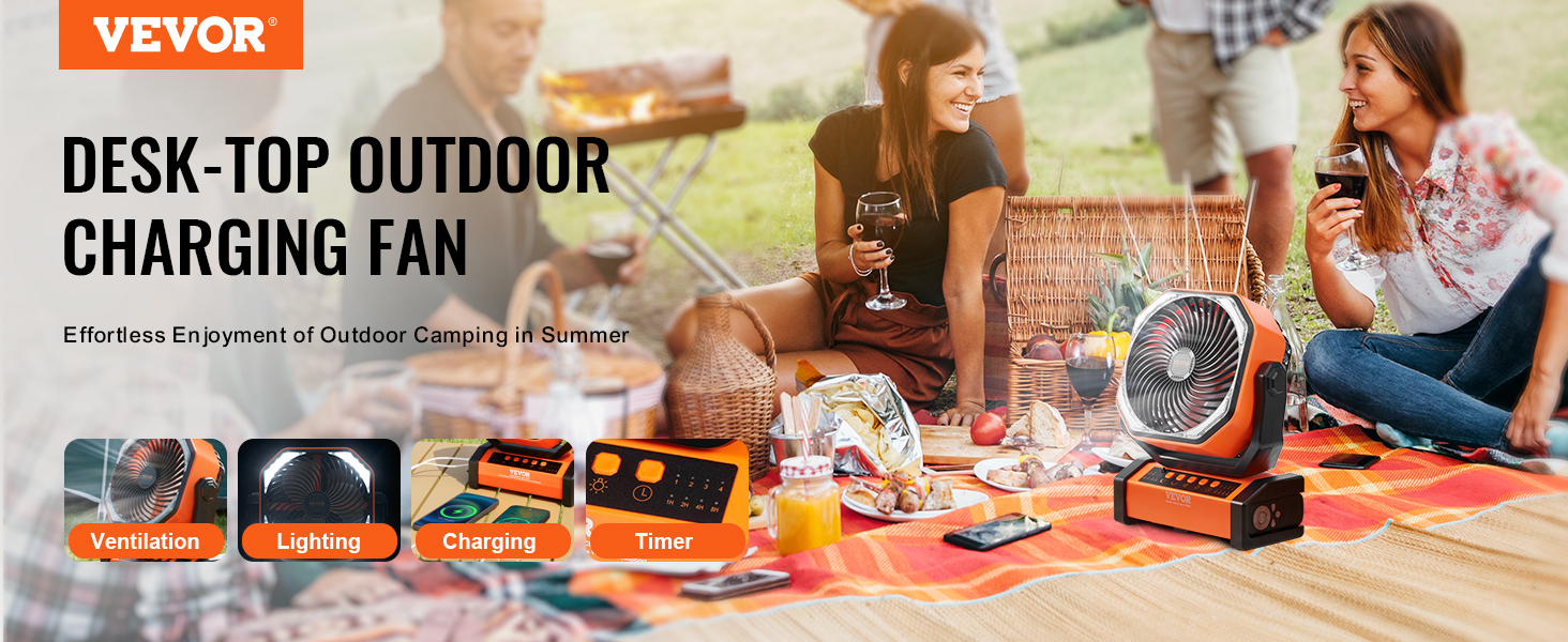 The VEVOR desktop charging fan features a brushless motor and dual fan blade design, increasing airflow and offering 4 adjustable fan speeds for various wind modes to meet different needs. It is compact, lightweight, and easy to carry, making it ideal for picnics, barbecues, car trips, and more.