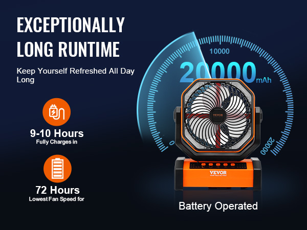 The fan has a built-in high-capacity battery and uses the latest fast charging technology, requiring just 9-10 hours for a full charge. With a single charge, it can run continuously for 72 hours at the lowest fan speed setting, keeping you cool and comfortable throughout the day.