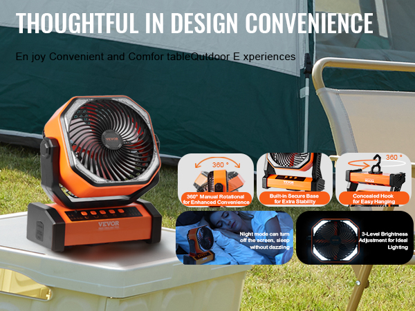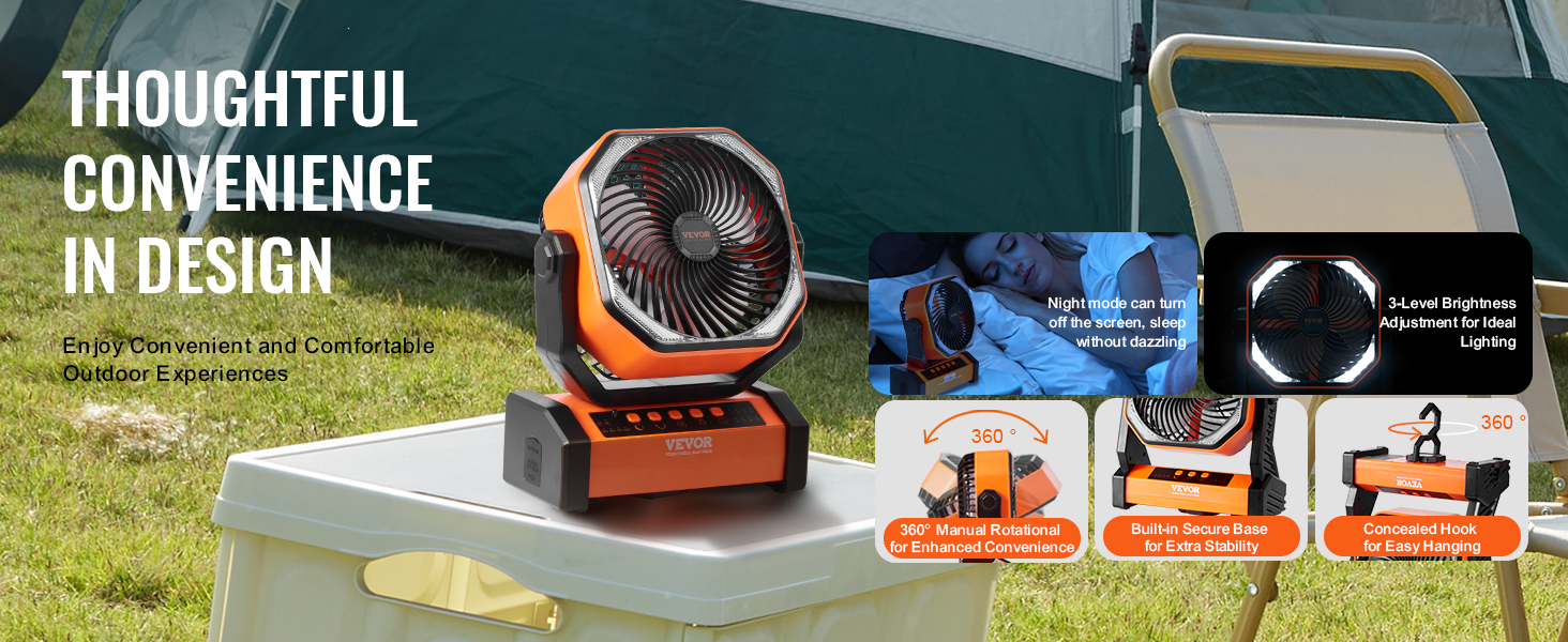 Come with 16 surrounding LED lights with 3 levels of adjustable brightness, providing an ideal light source for nighttime outdoor activities. The fan has a stable base that securely holds the fan even during high-speed operation.
