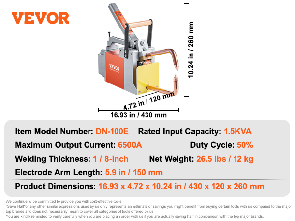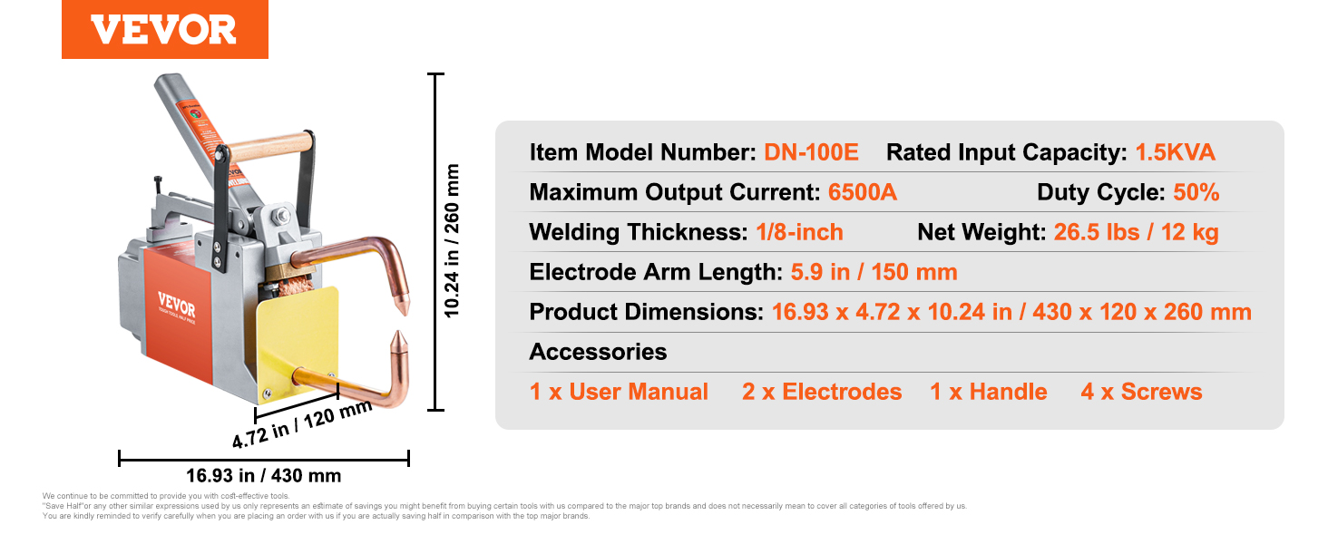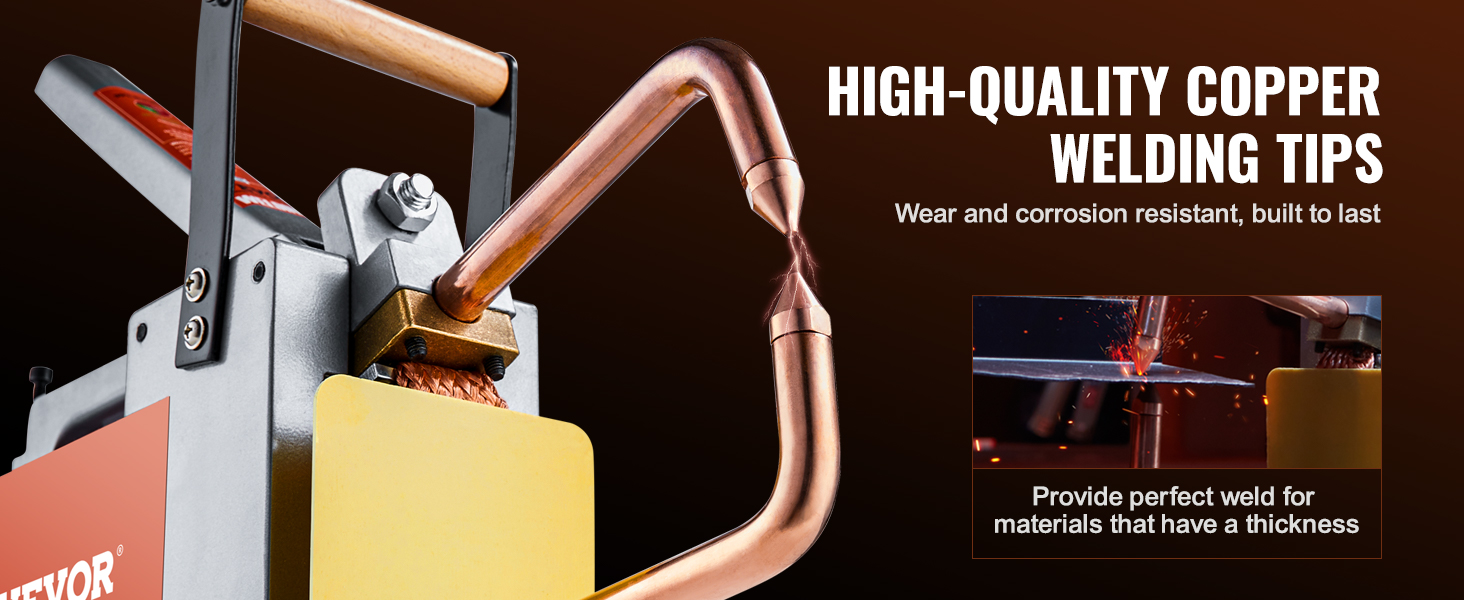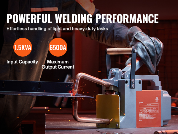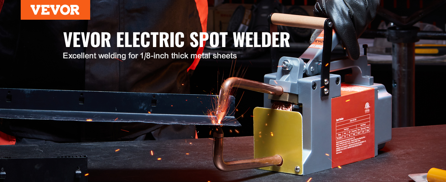 VEVOR portable spot welder efficiently welds steel sheets up to 1/8 inch thick (such as carbon steel). With 1.5KVA input capacity and 6500A maximum output current, it ensures quick and efficient welding results. (Not suitable for aluminum & stainless steel)