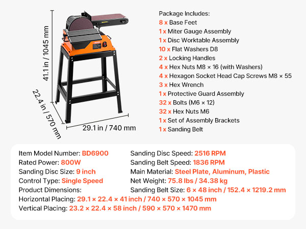 - Efficient Sanding: The VEVOR 9" disc sander & 6" x 48" belt sander combo is powered by a 800W motor, with the disc running at 2516 RPM and the belt running at 1836 RPM, providing strong power to efficiently complete various sanding tasks for wood and metal.