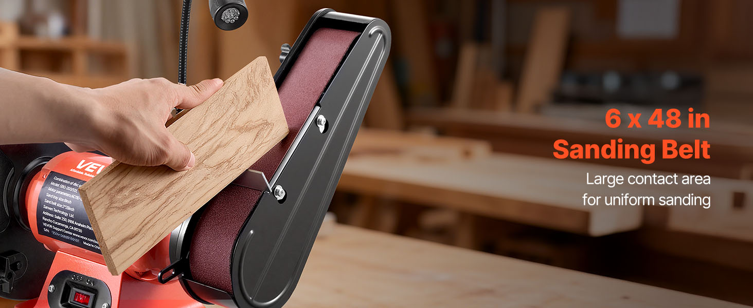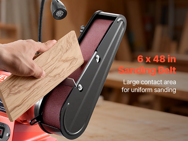 6″ x 48″ sanding belt provides a large working surface for uniform sanding, ensuring smooth, even and high-quality finishes.