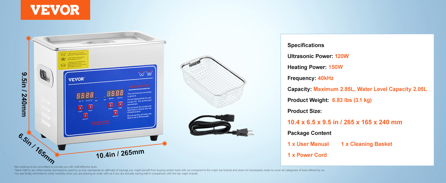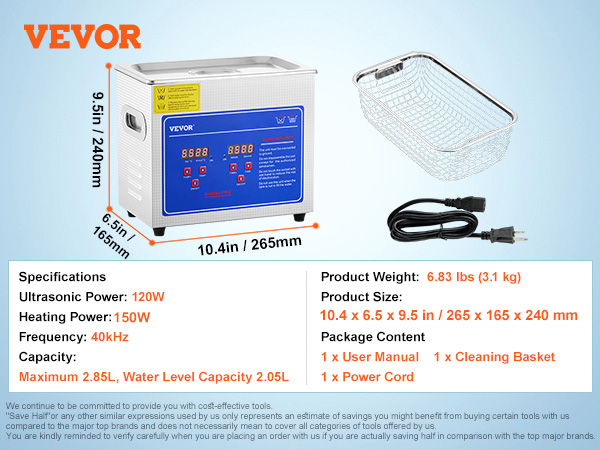 This was my first purchased from VEVOR and first Ultrasonic. I can’t be any happier with 15L, you’ll find the short coming was the size of the tank. I ordered a bigger one, and the both of them work hard at cleaning. Thanks, VEVOR for selling a great product.