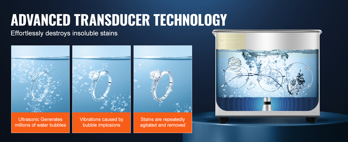 • Advanced Transducer Technology: Our ultrasonic jewelry cleaner features two advanced transducers equipped with sandwich-type piezoelectric transducers. Scientifically designed for enhanced cleaning efficiency and quality, it refreshes your items, whether for everyday use or professional cleaning needs.