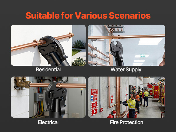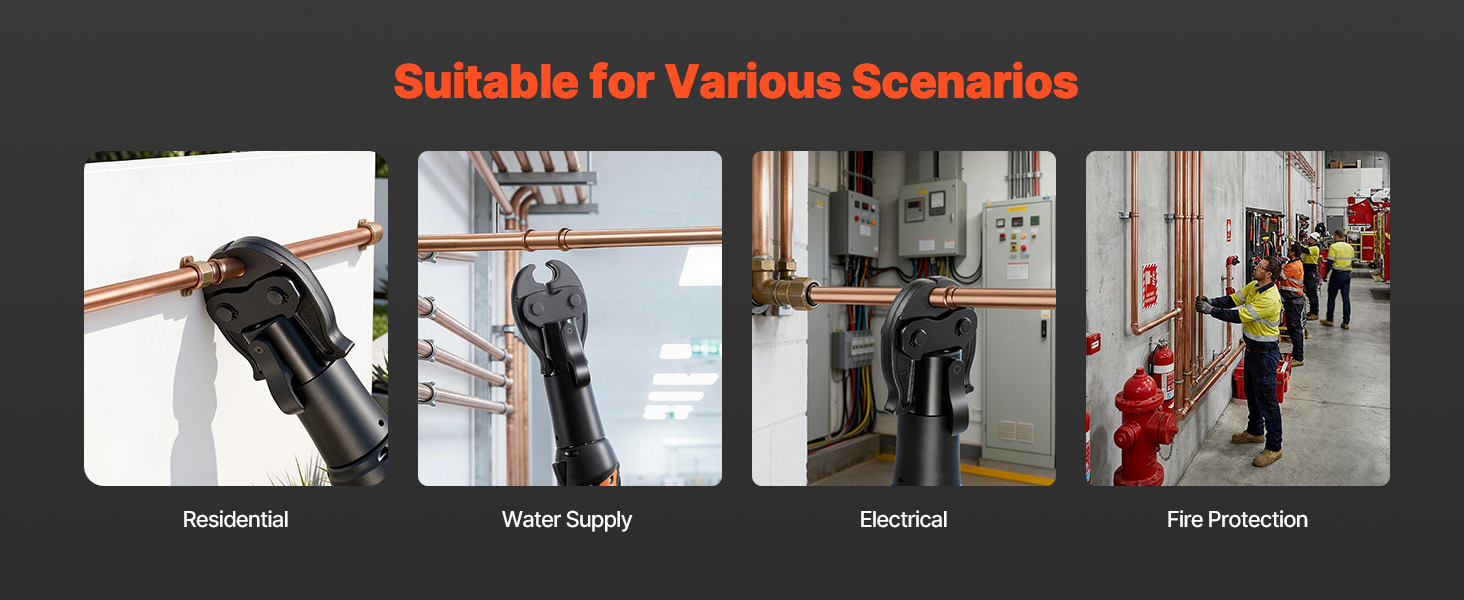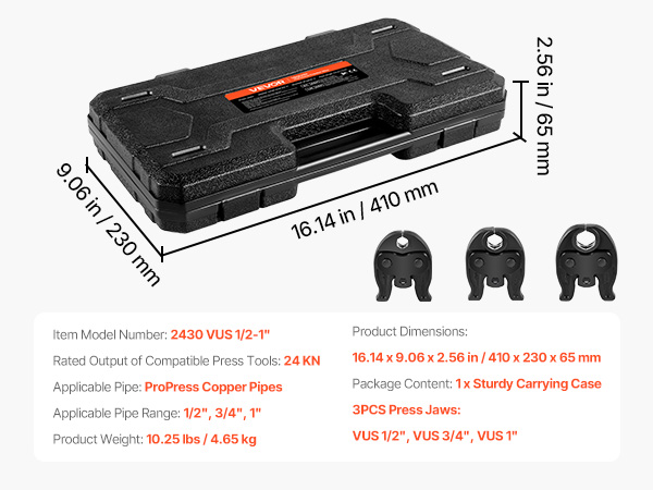 - 3PCS Pressing Jaws: The VEVOR ProPress jaws set includes 3 jaw sizes: VUS 1/2", VUS 3/4", VUS 1". Compatible with VEVOR 24KN compact electric press tools (MP-2430, SL-2430) and other brands (RP100-B, RP200-B, RP210-B, RP240, RP241, RP251, M12)