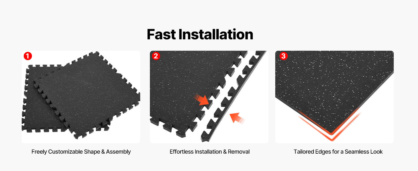 - Flexible Layout: This gym mats set features an interlocking design that enables quick, tool-free installation by a single person. It can be freely spliced and expanded according to space requirements, or cut to fit irregular areas