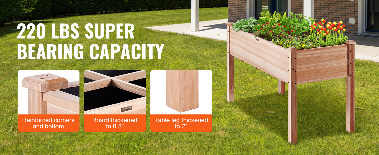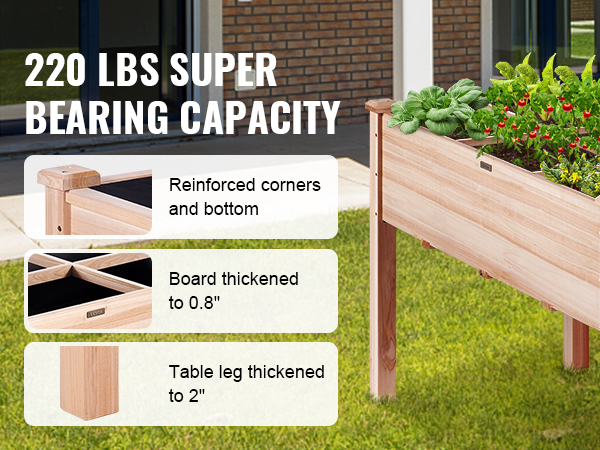 - Wood You Believe It: Are you tired of poorly put together equipment? Well, we have made sure to put time and effort into ours! The raised planter box is made of 100% fir wood, and it can hold up to 220 lbs/100 kg. Every corner is reinforced to ensure long-lasting outdoor use, not easy to break.