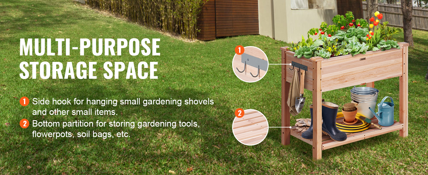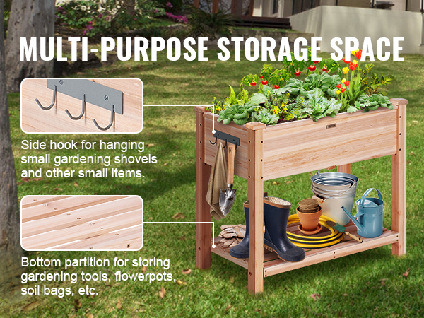 - Gardening At Its Finest: This elevated garden bed has 2 tiers for planting and storing. You can plant various vegetables and herbs in the box and store your gardening tools on the lower shelf. Besides, the hooks on the side allow you to hang some small items, making your planting experience more convenient and easier. Get ready to create a garden that your guests and yourself can admire. You will be the talk of the neighborhood.