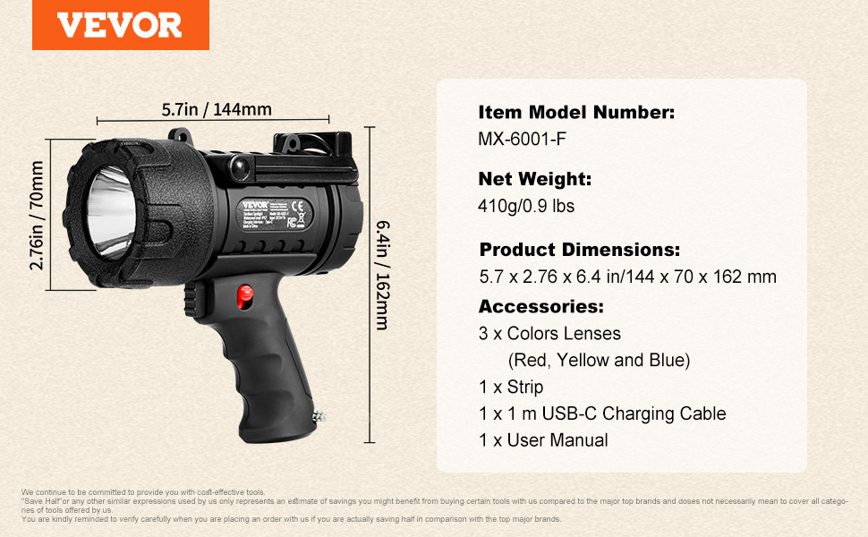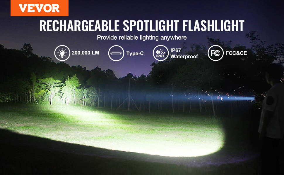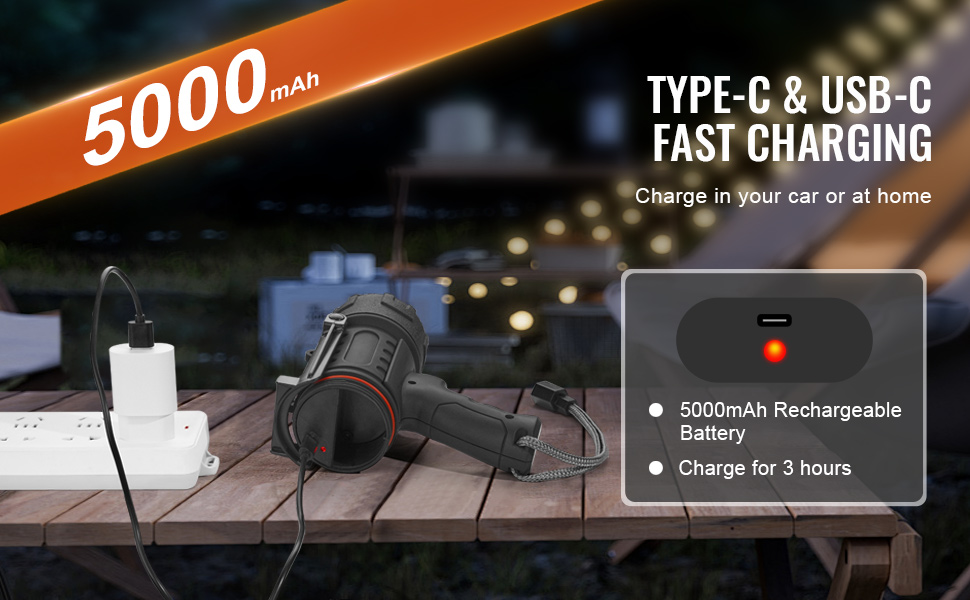 - Fast 3-Hour Charging: Thanks to cutting-edge USB-C charging technology, you can fully recharge this handheld spotlight flashlight in just 3 hours! Compatible with any USB charging port, you can power it up at home or in your car—making it easier than ever to stay ready for action. Spend less time waiting and more time enjoying bright light for all your adventures!