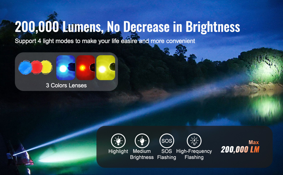 Our rechargeable spotlight flashlight features 4 distinct brightness modes: Highlight, Medium Brightness, SOS Flashing, High-Frequency Flashing. Plus, it comes with three detachable color lenses—red, yellow, and blue—so you can customize your lighting for any occasion. Be prepared for anything!