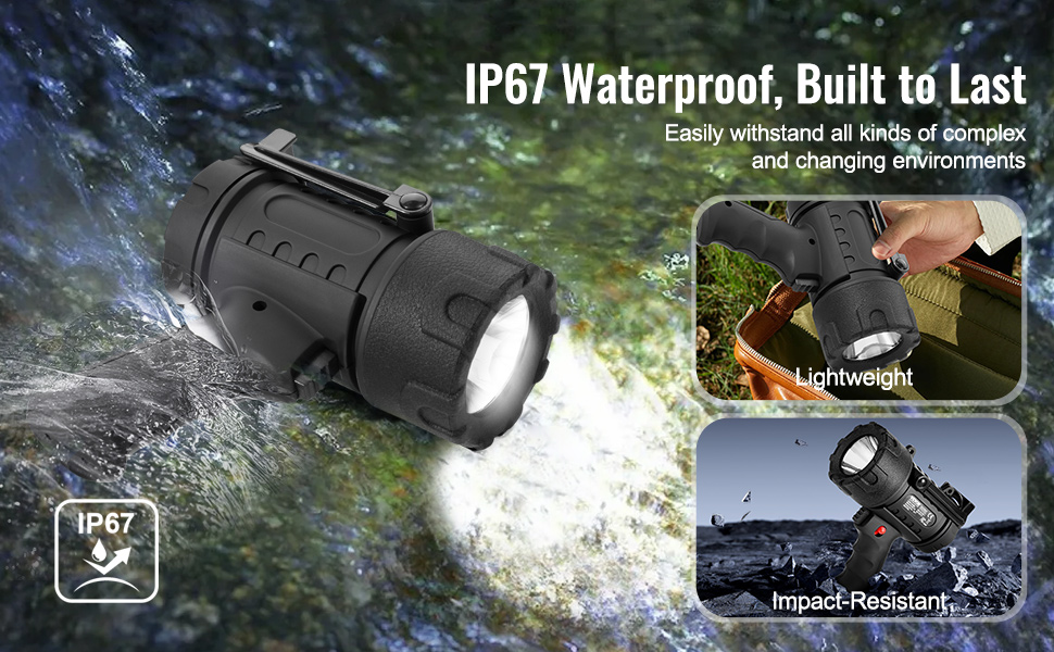 - IP67 Waterproof & Submersible: Built for the outdoors, our rechargeable spotlight boasts an IP67 waterproof rating. It can be submerged in water and even float back to the surface if dropped! Crafted with a robust ABS shell and silicone protection, it withstands impacts and is built to last, giving you peace of mind on all your excursions.