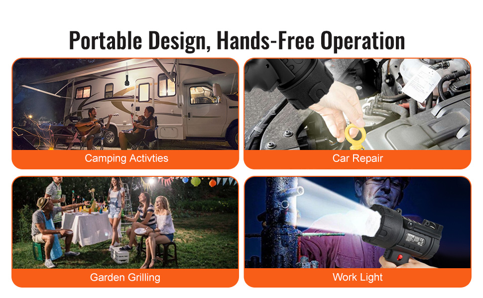 - Rechargeable Cordless Spotlight: Experience the brilliance of our portable, cordless spotlight! With an astounding 200,000 lumens and an impressive 350-meter beam distance, this LED spotlight flashlight is your ideal companion for outdoor adventures, emergencies, and everything in between.