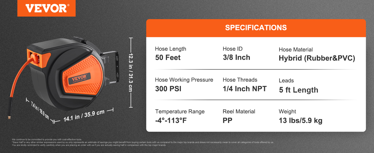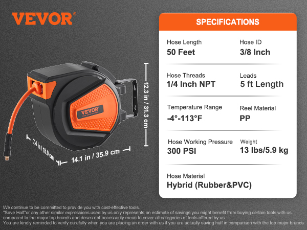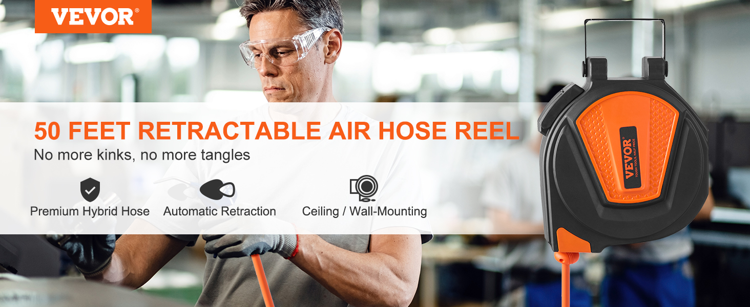 - For Everyday Use: VEVOR 50ft air reel is versatile and ideal for industrial and DIY applications. It's perfect for auto shops, workshops, home studios, garages, and even mobile mechanics. With our air reel, you can tackle any job with ease. Get prepared for your next project by choosing VEVOR.
