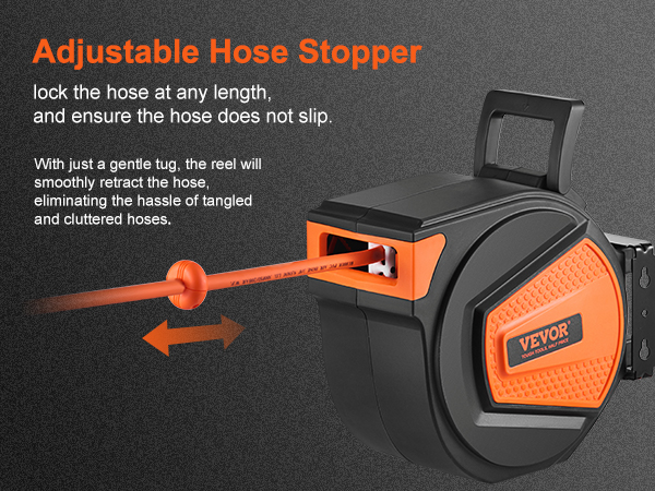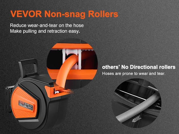 - Auto Rewind: The VEVOR Auto-Rewind air hose reel makes it easy to use your hose without any kinks. Simply give the hose a gentle tug and it will retract smoothly. The reel also has 1 non-snag roller that reduce hose wear and abrasion. You can adjust the stopper to lock the hose at any desired length.