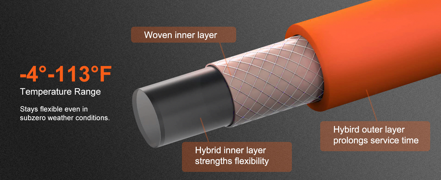 - Strong Hybrid Hose: The premium commercial 3/8" x 50' hybrid polymer hose has a working pressure of 300 PSI and features 1/4" NPT connections allowing it to connect to air tools. It's all-weather flexible with a temperature range of -4 to 113℉ and provides full control without flow cut-off or hose entanglement.