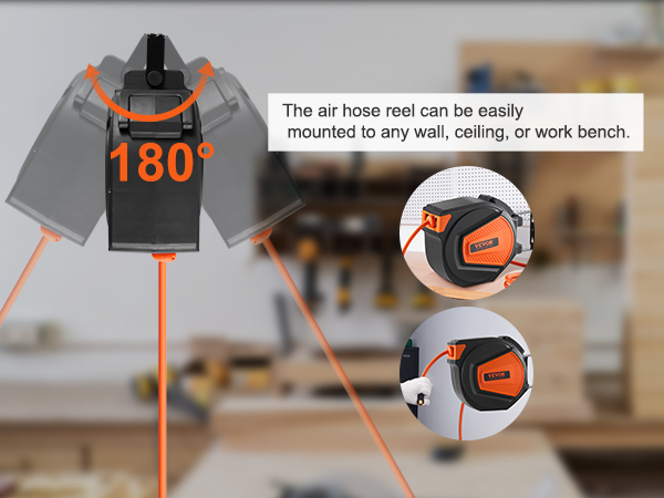 - 180° Mount Bracket: Comes with a 180° swivel bracket, the heavy gauge steel reel assembly can be mounted on the ceiling, wall, or floor. You can quickly and easily connect it to your air compressor in your workshop, garage, or basement.