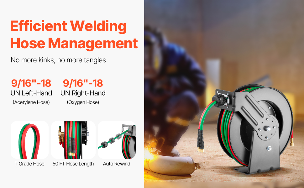 - Auto Rewind: With VEVOR's auto-rewind welding hose reel, managing your hose is simple and tangle-free. Simply give the hose a gentle tug and it will retract smoothly. The reel also has 4 non-snag rollers that reduce hose wear and abrasion. And you can adjust the stopper to lock the hose at any desired length.