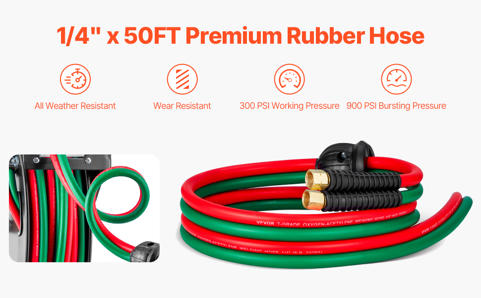 - 50FT T-Grade Welding Hose: Our 50FT x 1/4-inch oxygen acetylene rubber hose is suitable for use with oxygen and most fuel gases, such acetylene, propane or natural gas. It supports 300 PSI maximum working pressure and 900 PSI bursting pressure, offering exceptional durability and efficient gas transmission for welding tasks.
