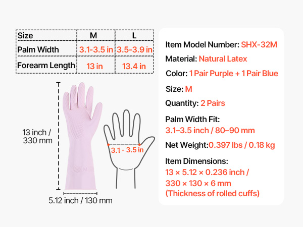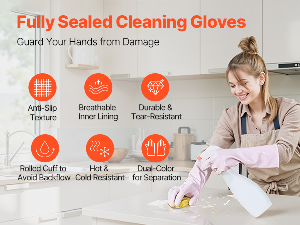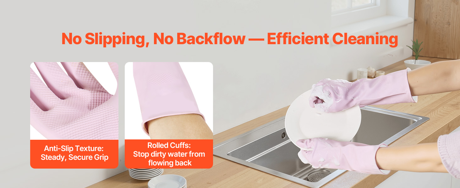 • Thoughtful Design: These dishwashing gloves feature a non-slip textured surface, ensuring a firm grip even in wet conditions. The rolled cuffs keep water from flowing back into the gloves, keeping your hands dry throughout the cleaning process