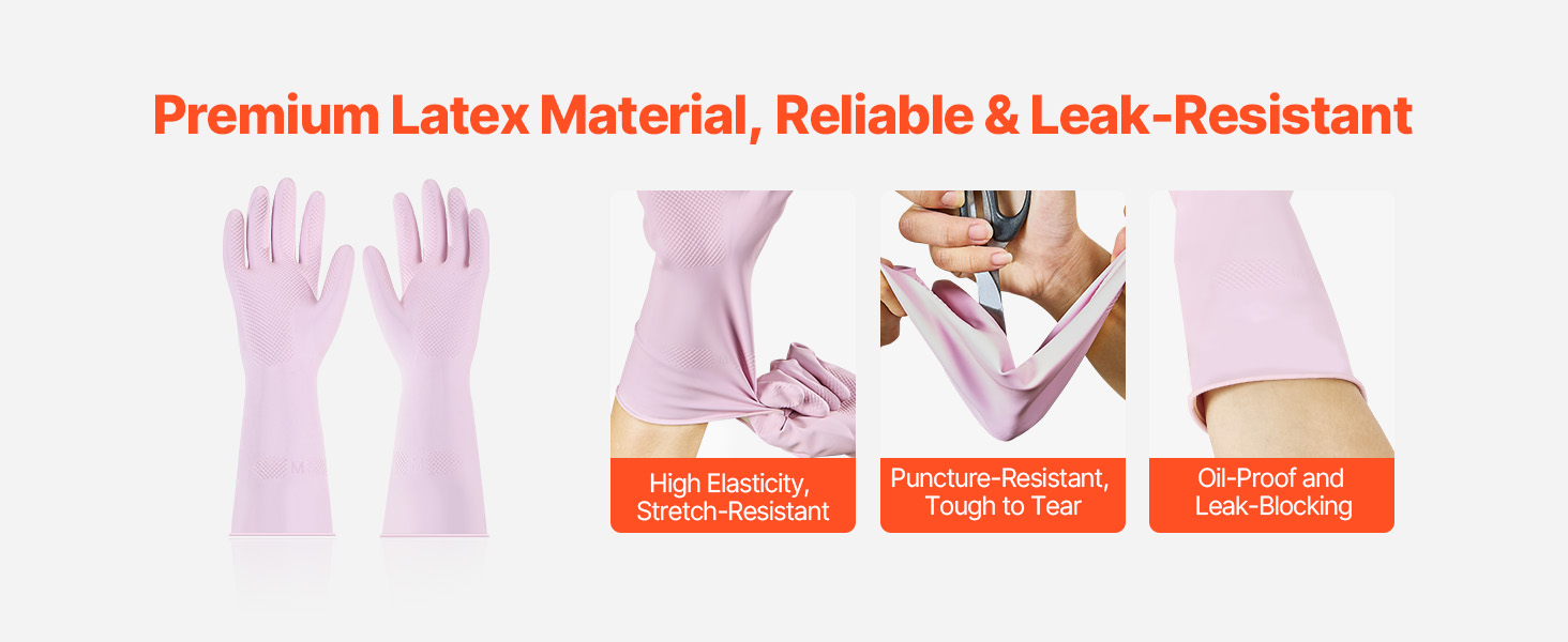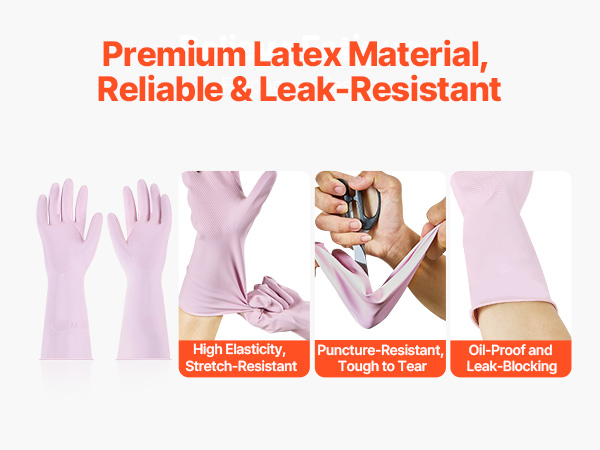 • Premium Latex: Our cleaning gloves are made from natural, green latex, with no odor, providing a leak-proof seal to keep your hands from water damage. The gloves are tough, durable, and resistant to tearing, making them ideal for repeated use