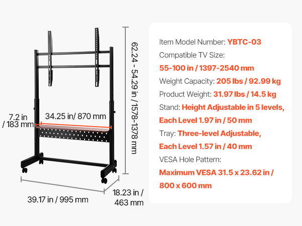 - Universal Compatibility: This rolling TV stand is designed for 55–100 in LED, LCD, and OLED flat and curved TVs, supporting a maximum VESA 800 x 600 mm. It ensures ideal compatibility with your TV, making installation easy regardless of the size or type of your TV.