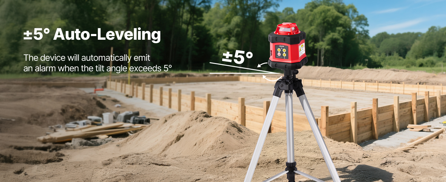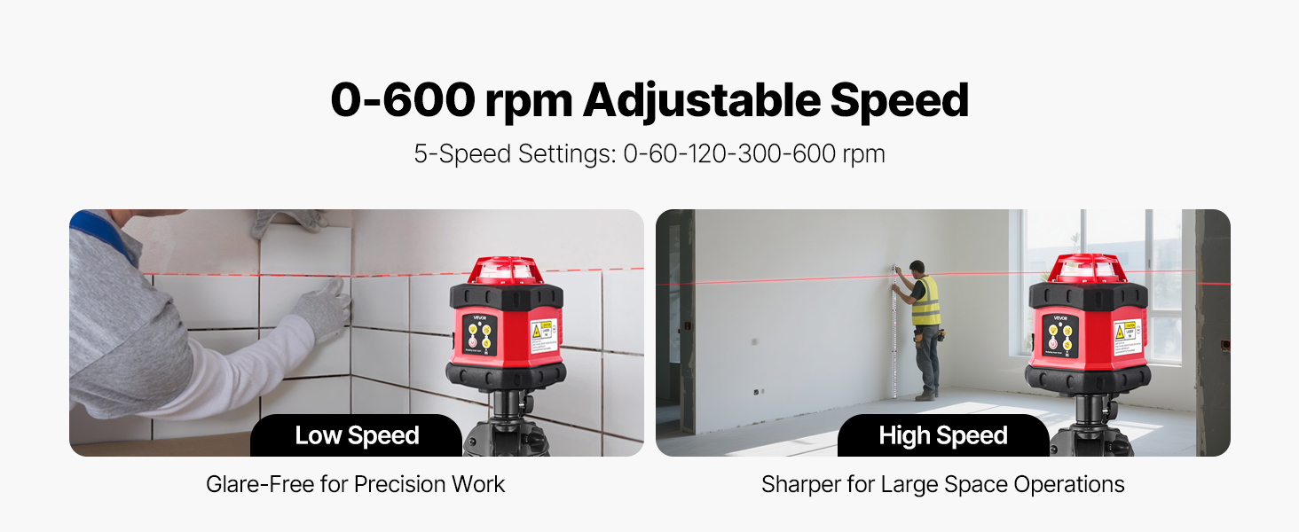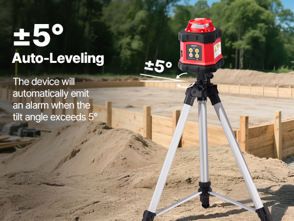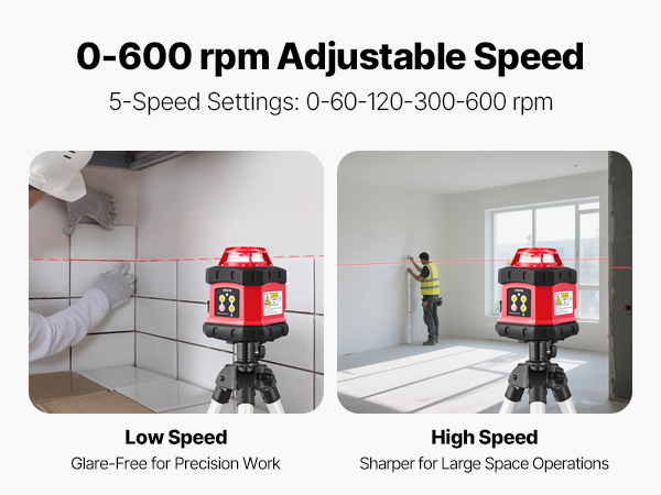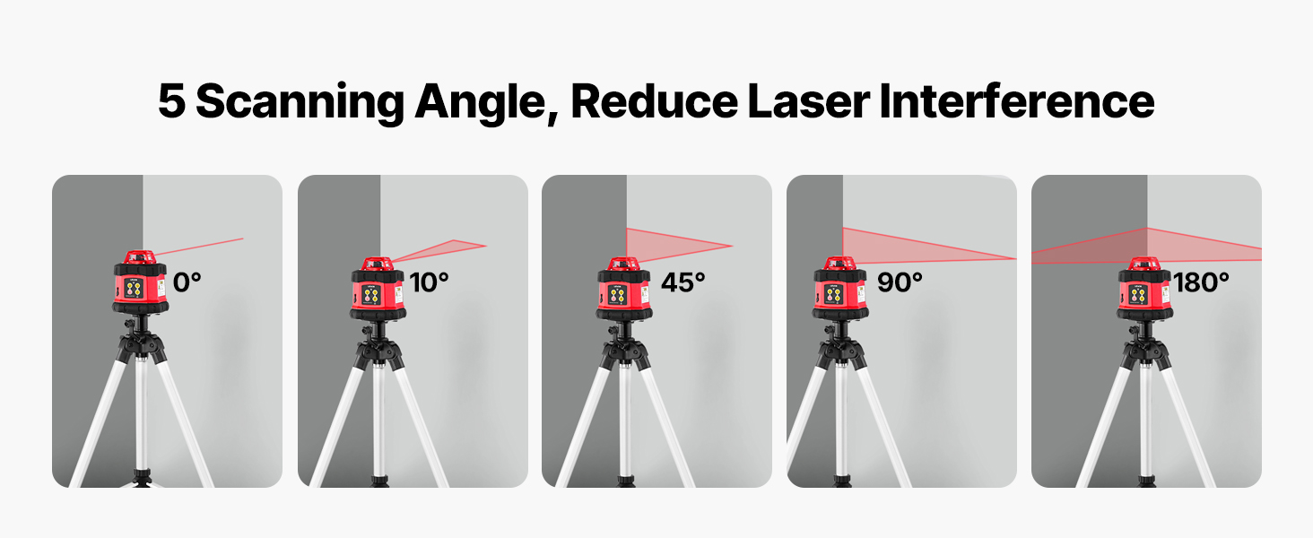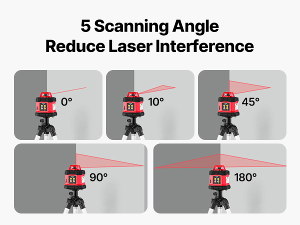 - 360-Degree Rotating Scan: Self-leveling rotary laser level for efficient site-wide leveling and alignment. ±5° self-leveling with manual mode. Variable speeds (0/60/120/300/600 rpm) and scan angles (0°, 10°, 45°, 90°, 180°) cover every task.