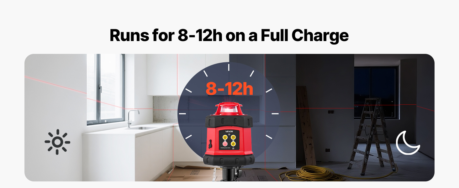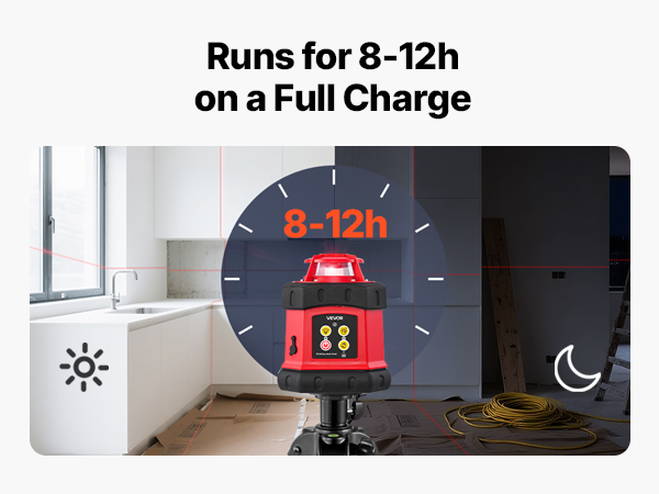 - Rechargeable Power: Driven by four 1.2V NiMH cells, the rotary laser runs 8–12 hours per charge (charger included), keeping you productive without frequent battery swaps