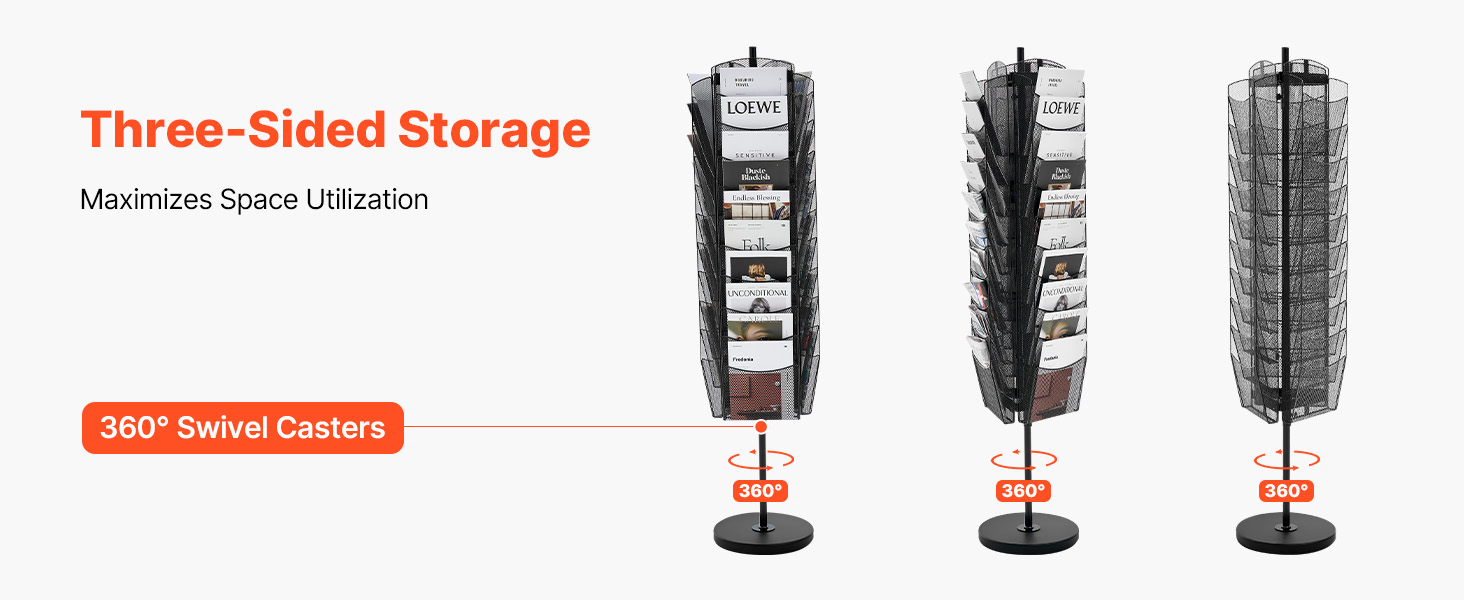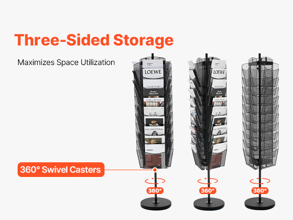 The brochure display rack features a unique 3-sided storage design, making full use of every inch of space. It supports 360° rotation, allowing you to easily adjust the display angle as needed, ensuring that the displayed content is clearly visible from any direction.