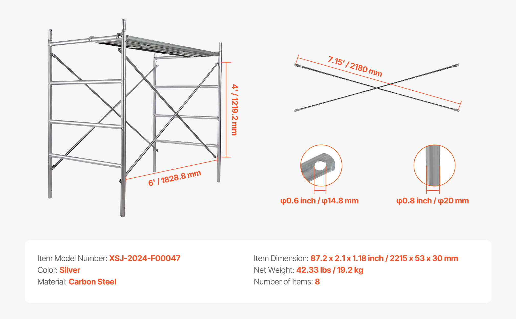 - Compatible with 6ft Scaffolding Frames: Our scaffold cross braces span up to 7.15' (2180 mm) with fixed hole diameters of 0.6'' (14.8 mm), making them compatible with 6 ft scaffolding frames. The solid rod ensures stability and avoids deformation, allowing for faster and safer scaffolding operations.