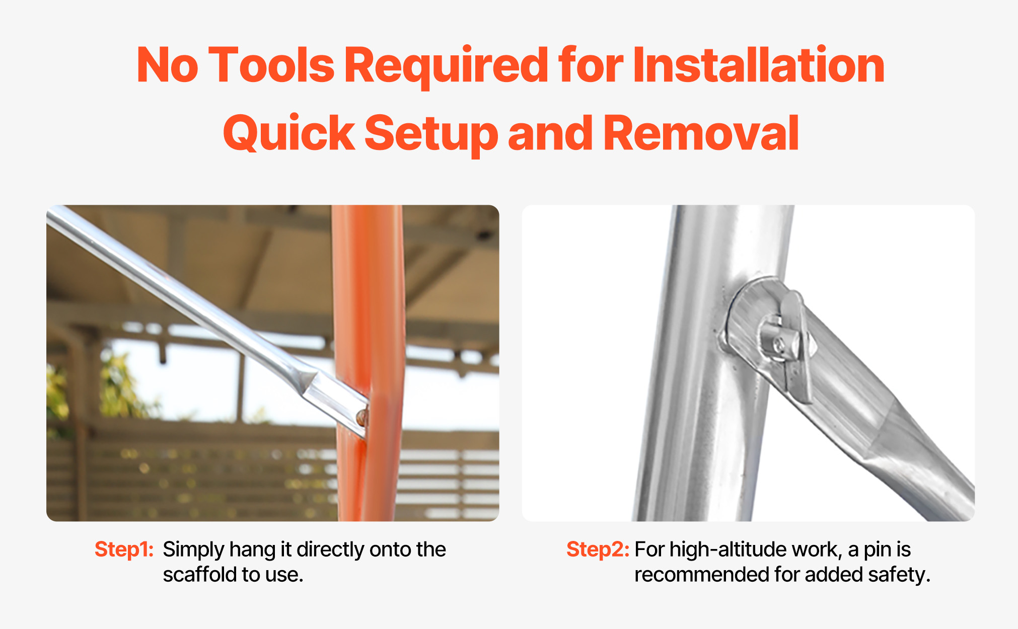 Directly hang our adjustable scaffold cross braces onto the scaffolding. If your scaffolding includes safety pins, we recommend using them for enhanced security.