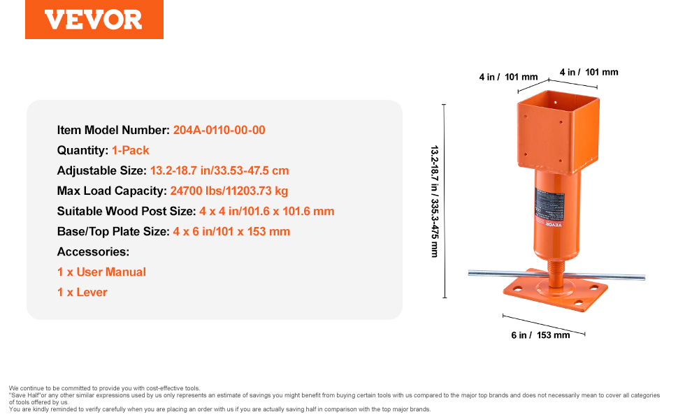 - Fits Standard 4 x 4 in/101.6 x 101.6 mm Wood Post: Perfectly sized for standard 4 x 4 in/101.6 x 101.6 mm wood post, this adjustable floor jack fits most common applications with ease.