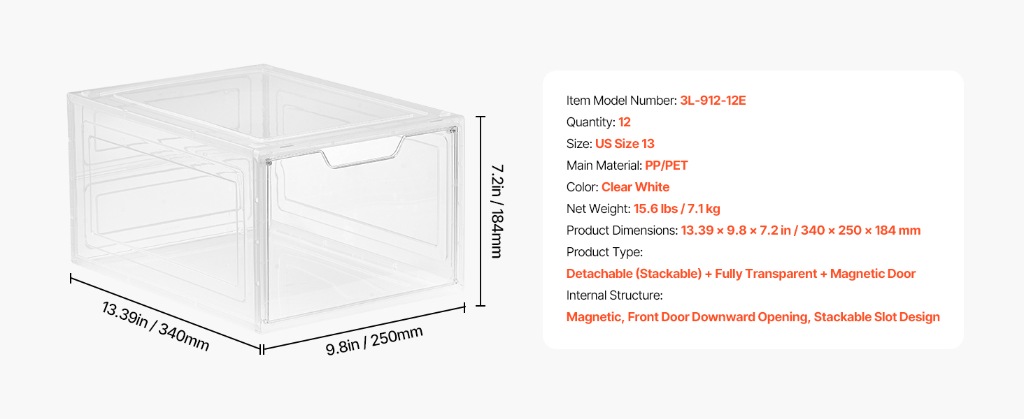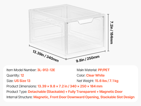 - Spacious and Versatile: Generous size (13.39 x 9.8 x 7.2 in) fits a wide range of shoe types and sizes. Our stackable shoe boxes are also ideal for hats, clothing, small items, toys, and more. The clear design allows you to quickly find what you need.