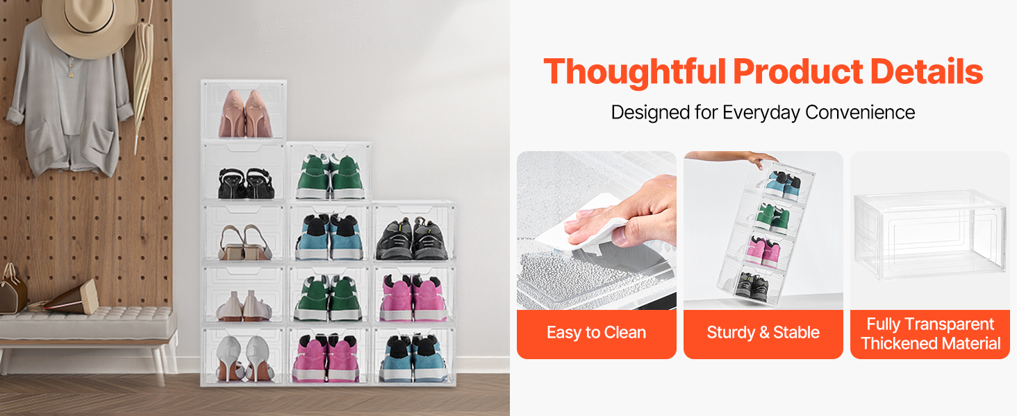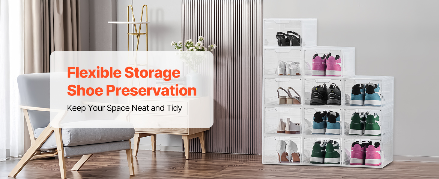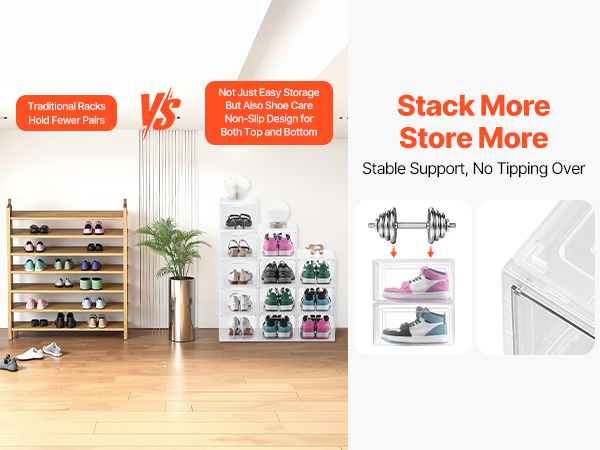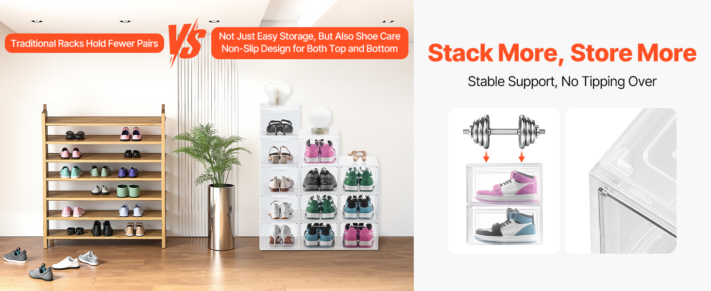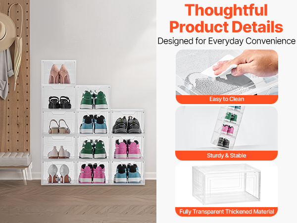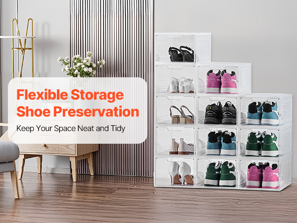 - Stackable Design: Top and bottom non-slip features ensure stable stacking, making clear shoe boxes easy to organize in any corner of your home. The reinforced material supports additional boxes, enabling you to store more shoes and maintain a tidy space.