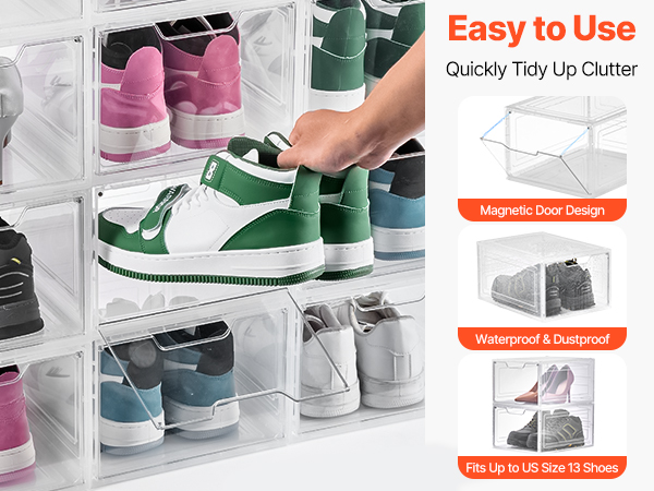 These spacious shoe organizer boxes fits up to US Size 13 shoes. The magnetic door design keeps your shoes dust-proof and water-proof, providing maximum care for your footwear.