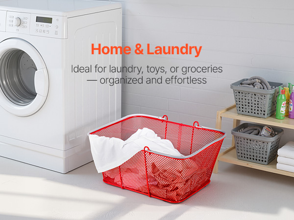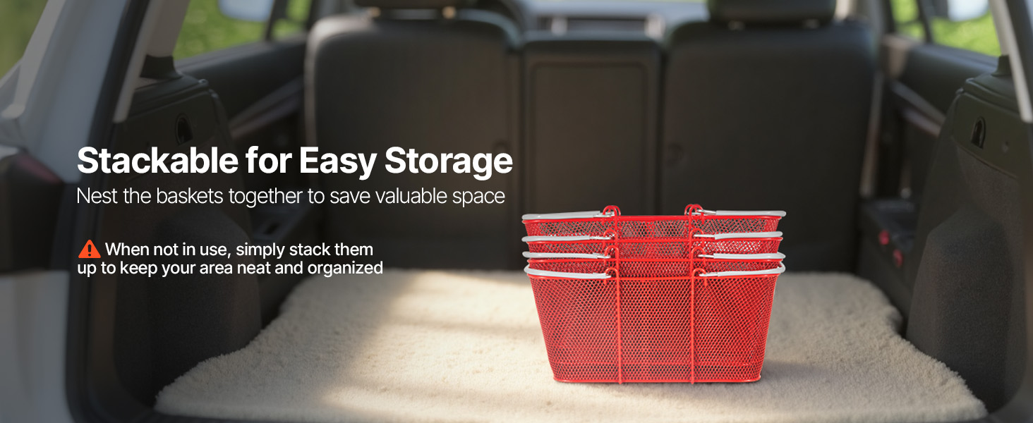 - Stackable for Space Saving: The strong steel handles with rubber provide a secure, comfortable grip. When not in use, our grocery baskets with handles stack vertically for easy storage and organization, staying portable and convenient