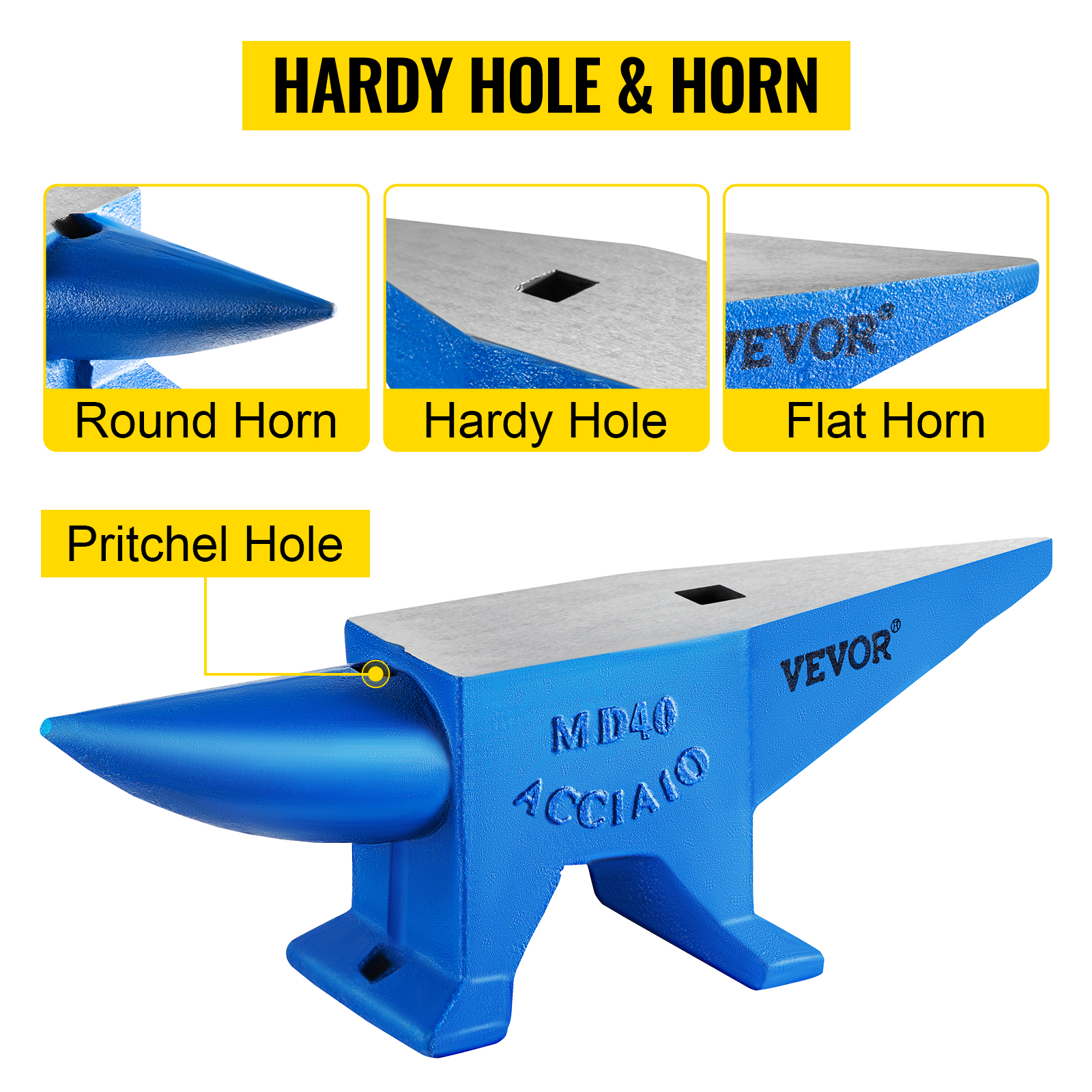 - Holes & Horns for Different Uses: Round horn and the flat horn of the anvil blacksmith are used for smoothing, bending, and shaping. And the hardy hole and pritchel hole can show a good performance in accessories’ punching and twisting.