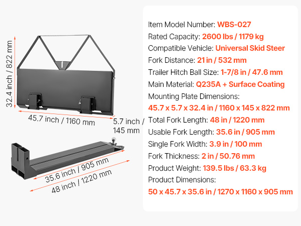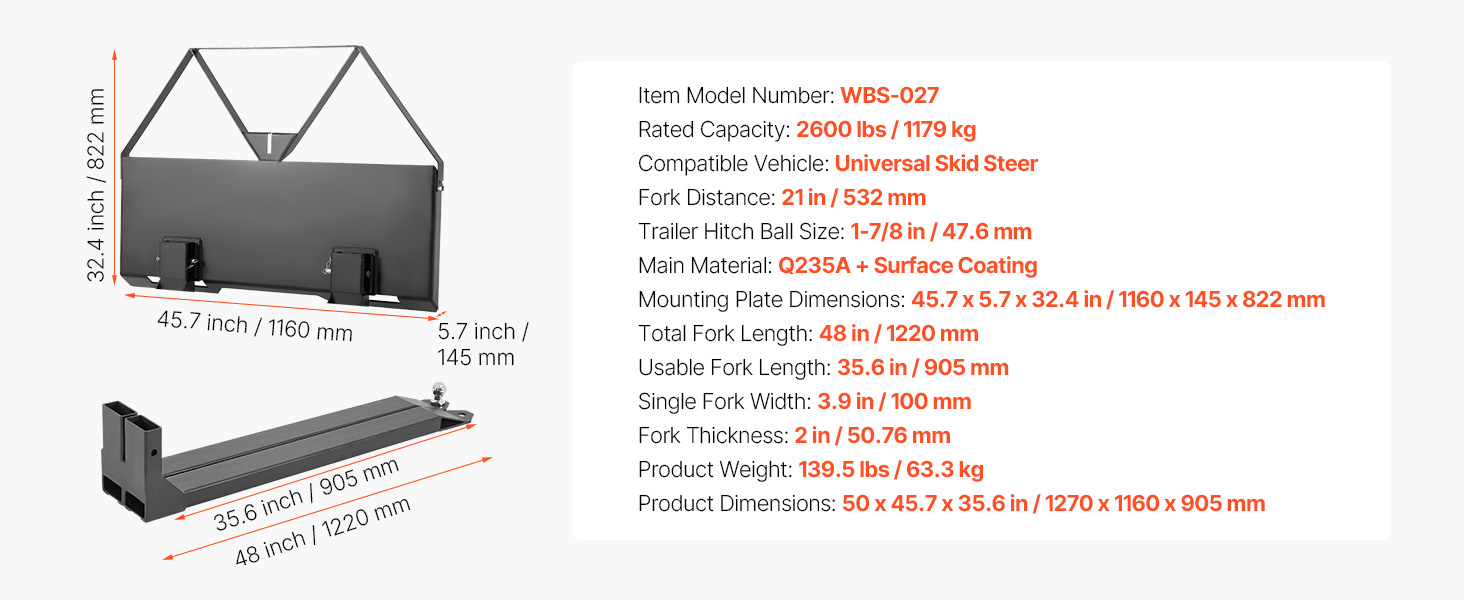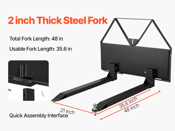 - 2600 lbs Strong Load Capacity: Our steel skid steer forks support up to 2600 lbs (mounting plate size: 45.7 x 5.7 x 32.4 in; total fork length: 48 in). Ideal for farm, warehouse, and short-distance transport, with 21-inch spacing and a guardrail to prevent item loss