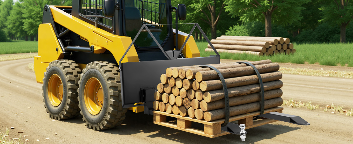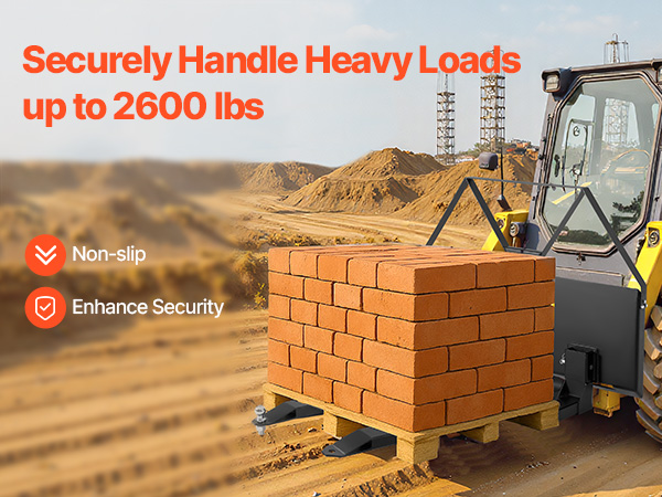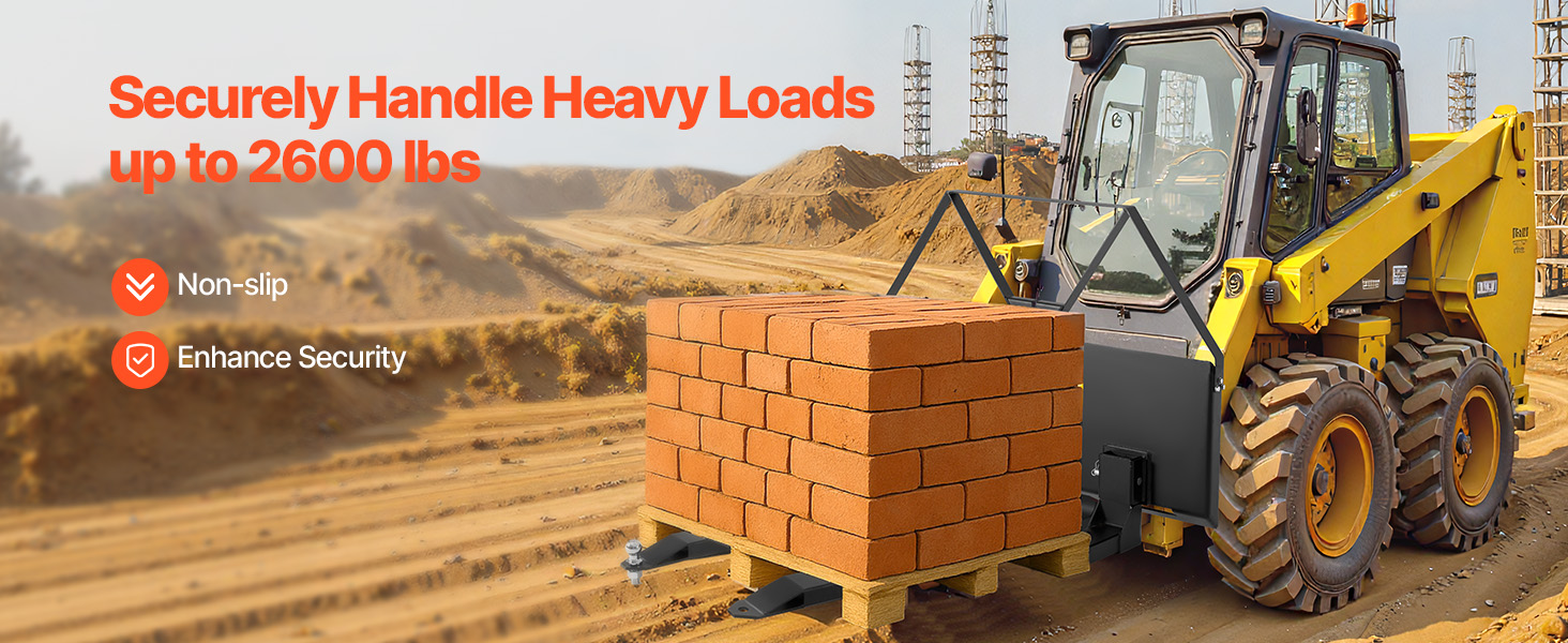 Our heavy-duty steel skid steer forks are rated for 2600 lbs and compatible with most skid steers and tractors. Ideal for farm, garden, and construction tasks, moving hay bales, building materials, and more.