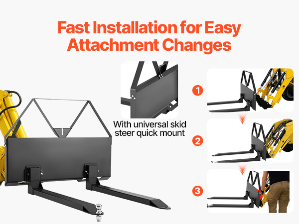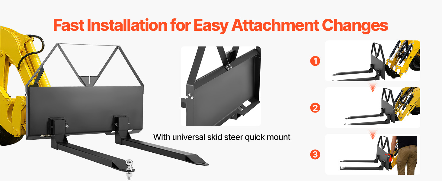 - Quick Installation: No tools required! The universal pallet forks frame attachment fits most loaders, tractors, and skid steers. Install quickly and easily for more efficient work