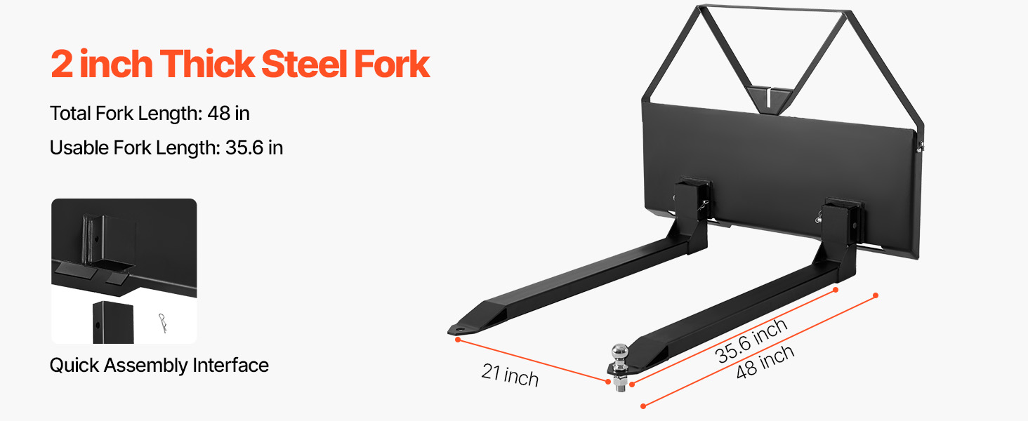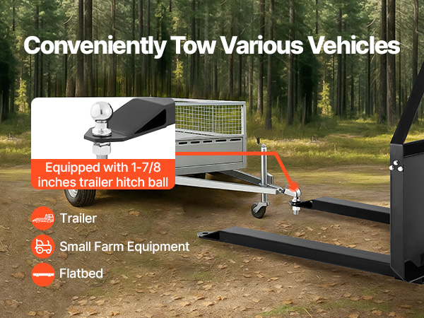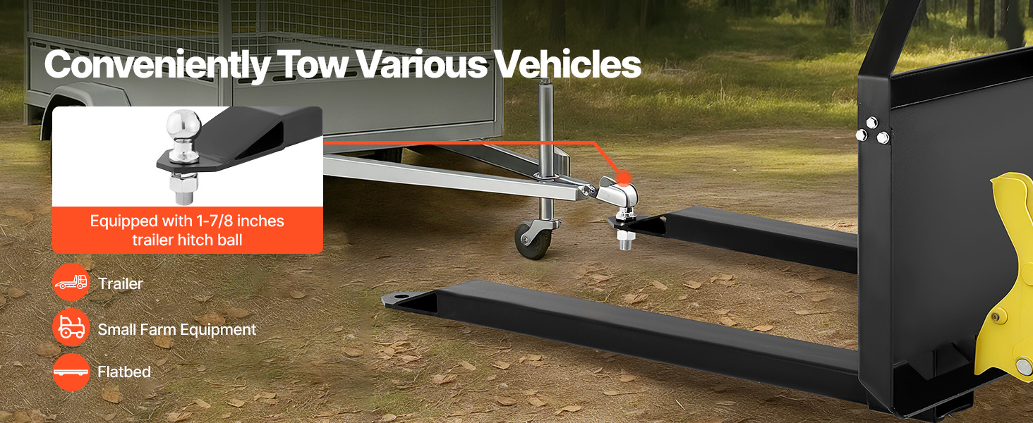 - Versatile Towing Function: The 1-7/8 inch trailer ball connector of the pallet fork frame makes it easy to extend your towing capabilities. Move trailers, flatbeds, or small equipment effortlessly with this flexible, convenient design